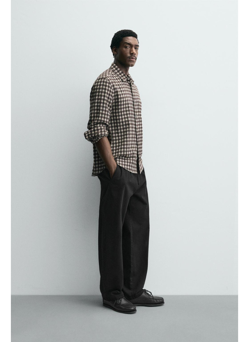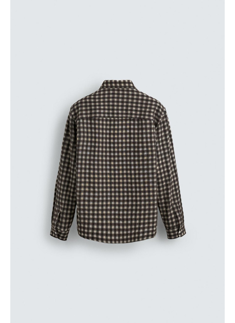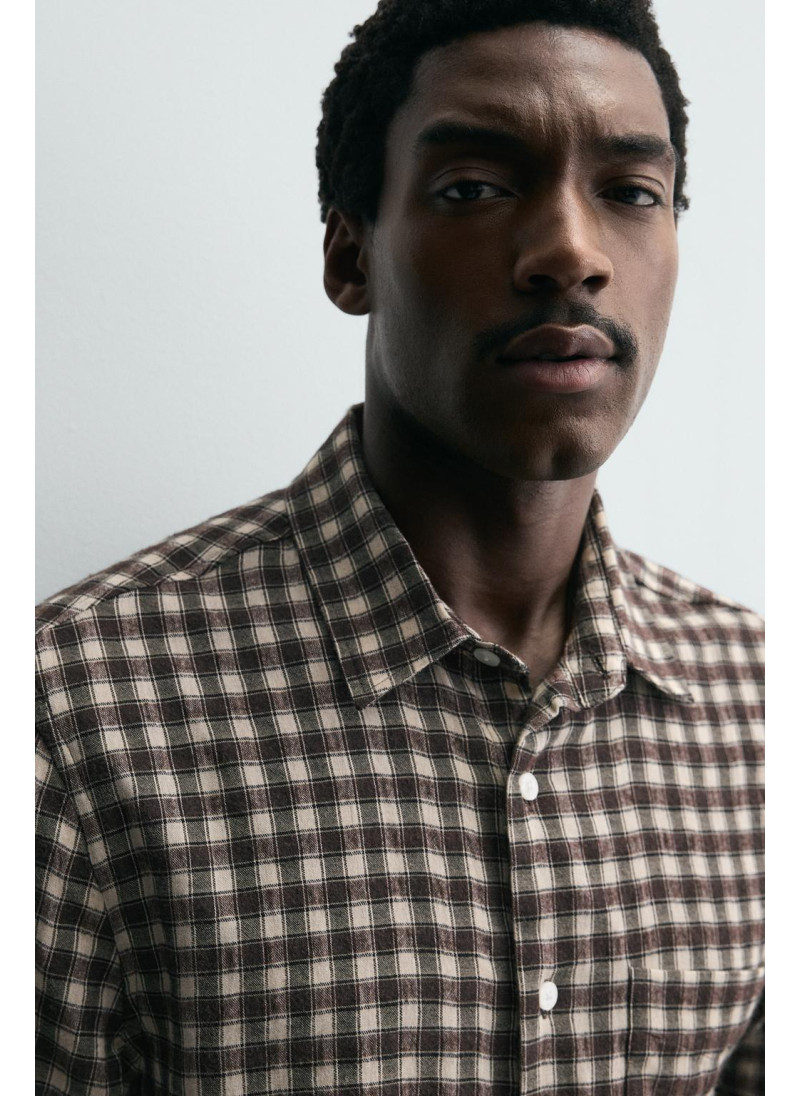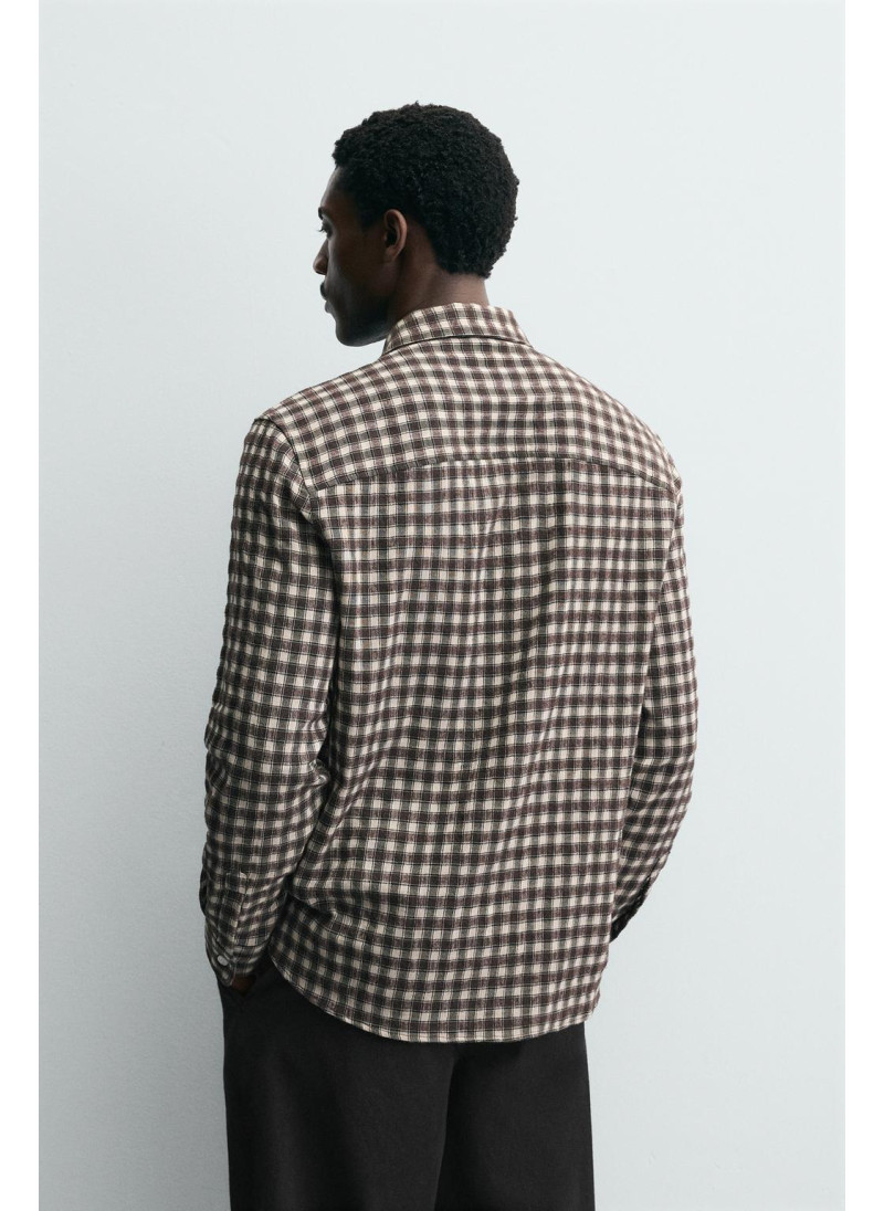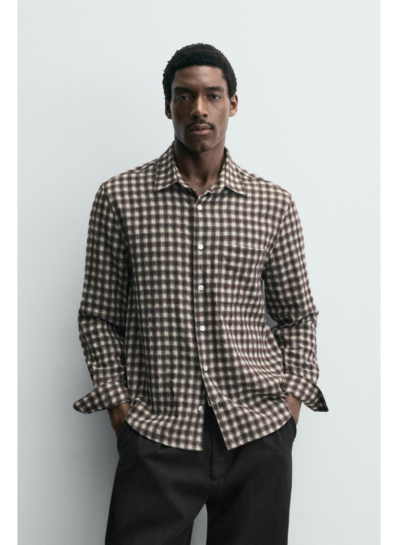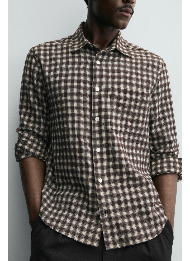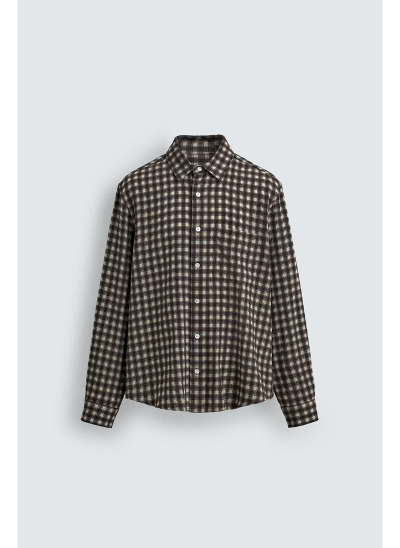 Рубашка свободного кроя из хлопковой ткани. Имеет отложной воротник и длинные рукава с застежкой на пуговицы. Нагрудный накладной карман. Передняя планка на пуговицах.