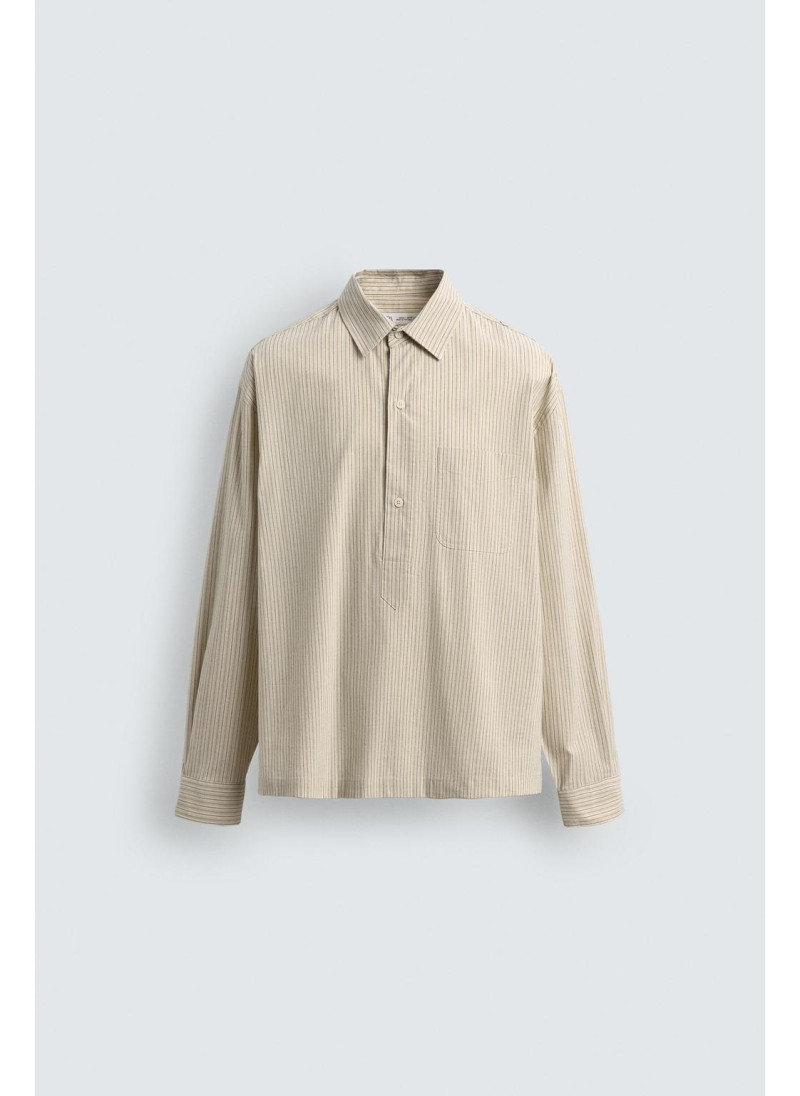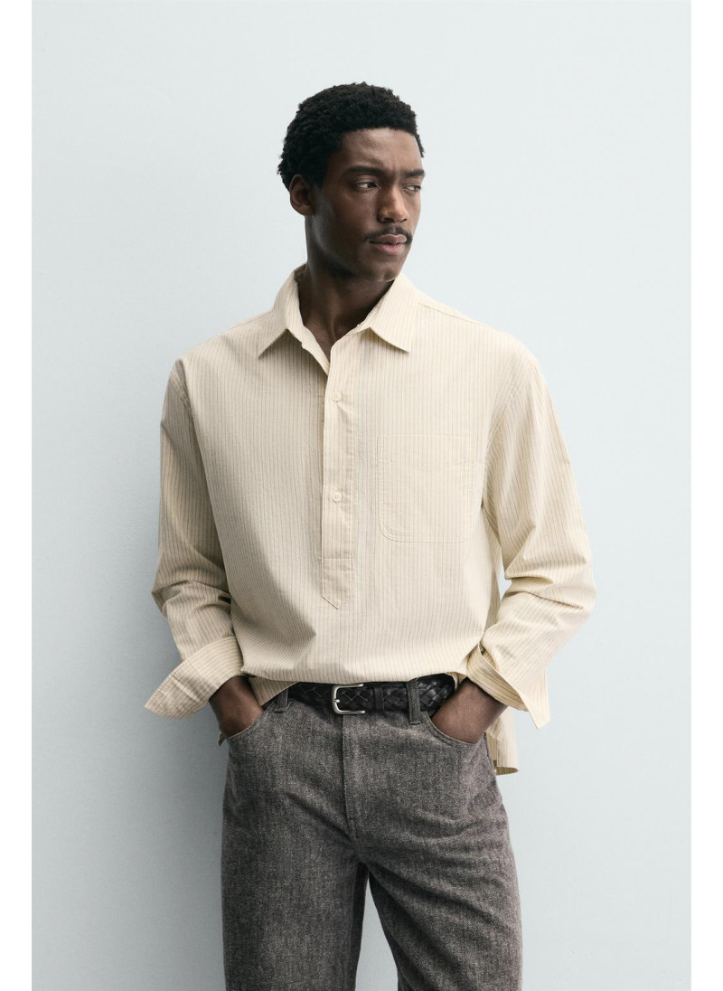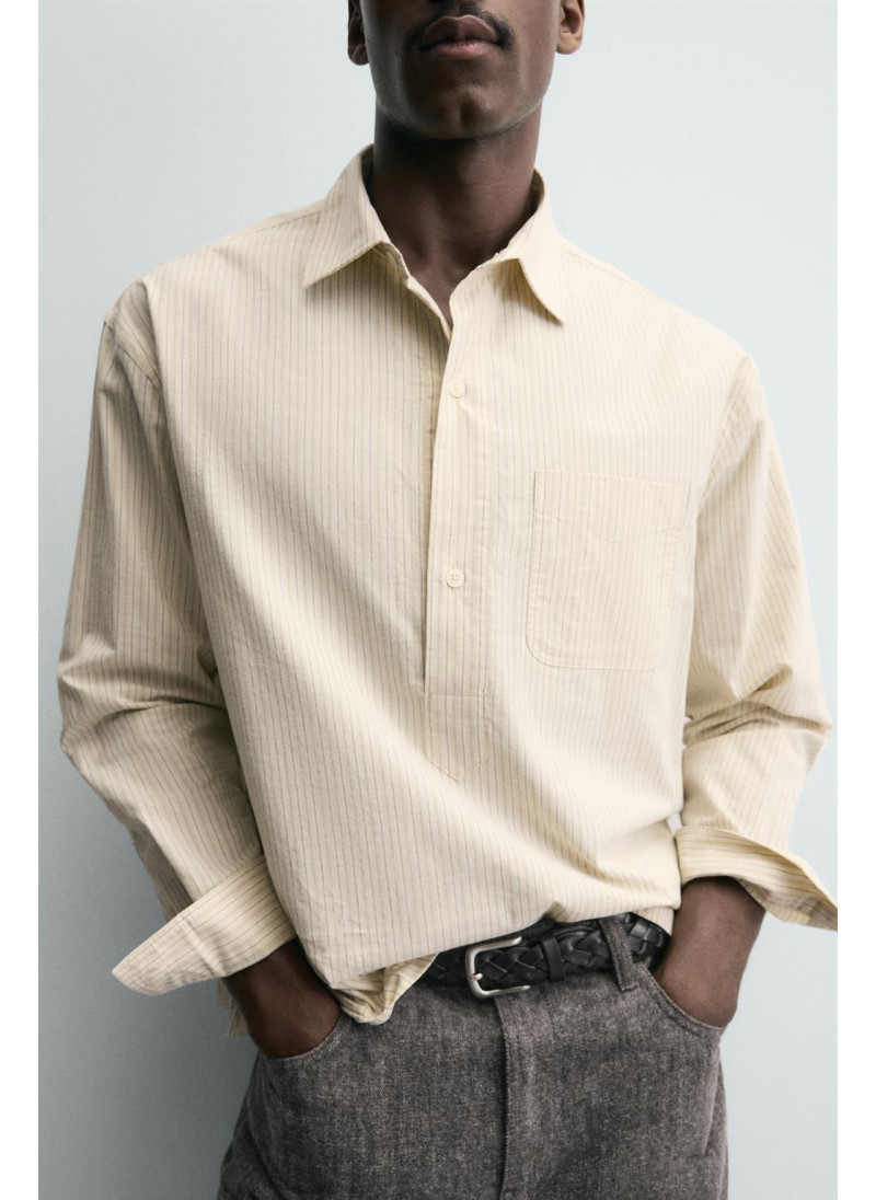 Рубашка поло свободного кроя из хлопковой ткани. Отложной воротник с застежкой на пуговицы спереди. Нагрудный накладной карман. Длинные рукава с манжетами на пуговицах.