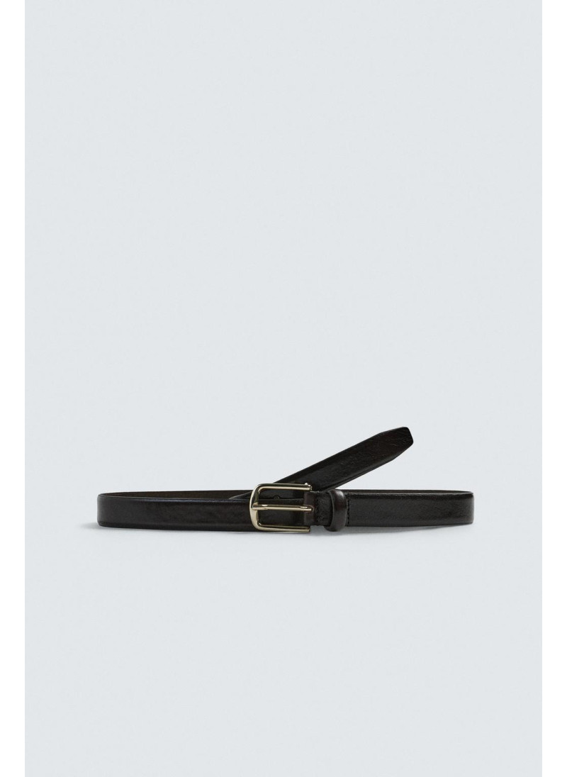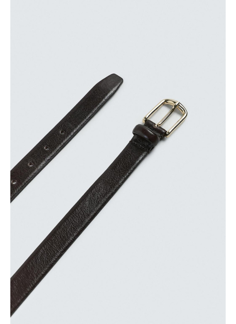 Кожаный пояс с тонкими стежками по краям. Застежка на металлическую пряжку и петлю. Ширина 2,5 см.