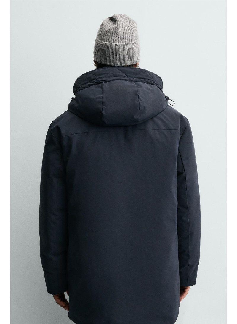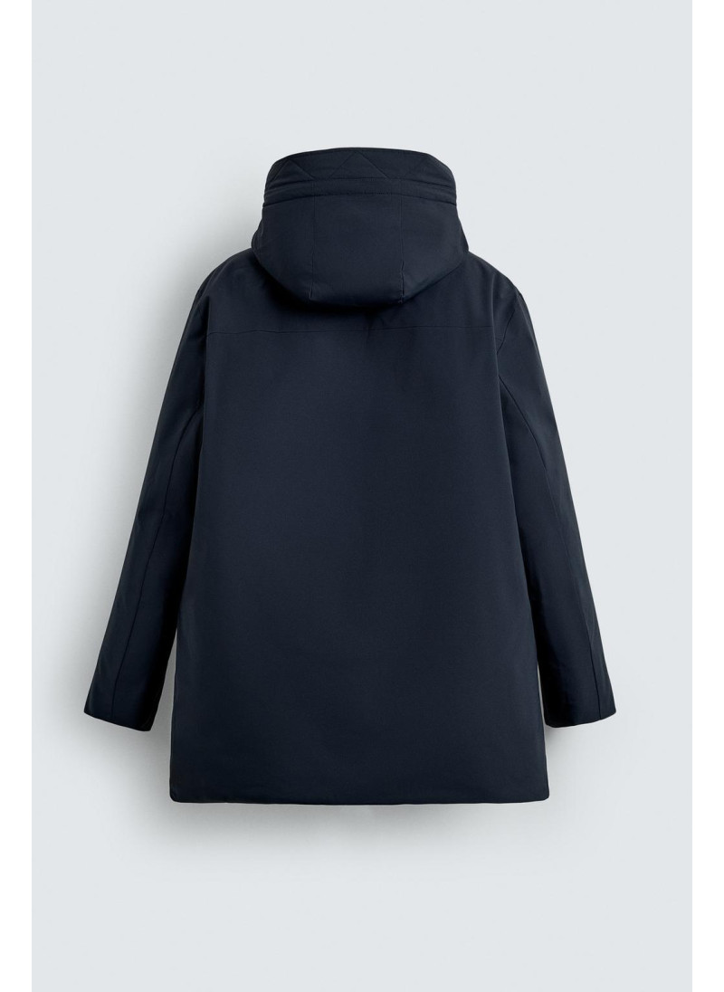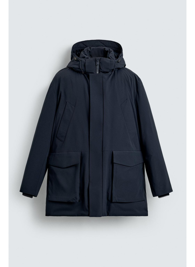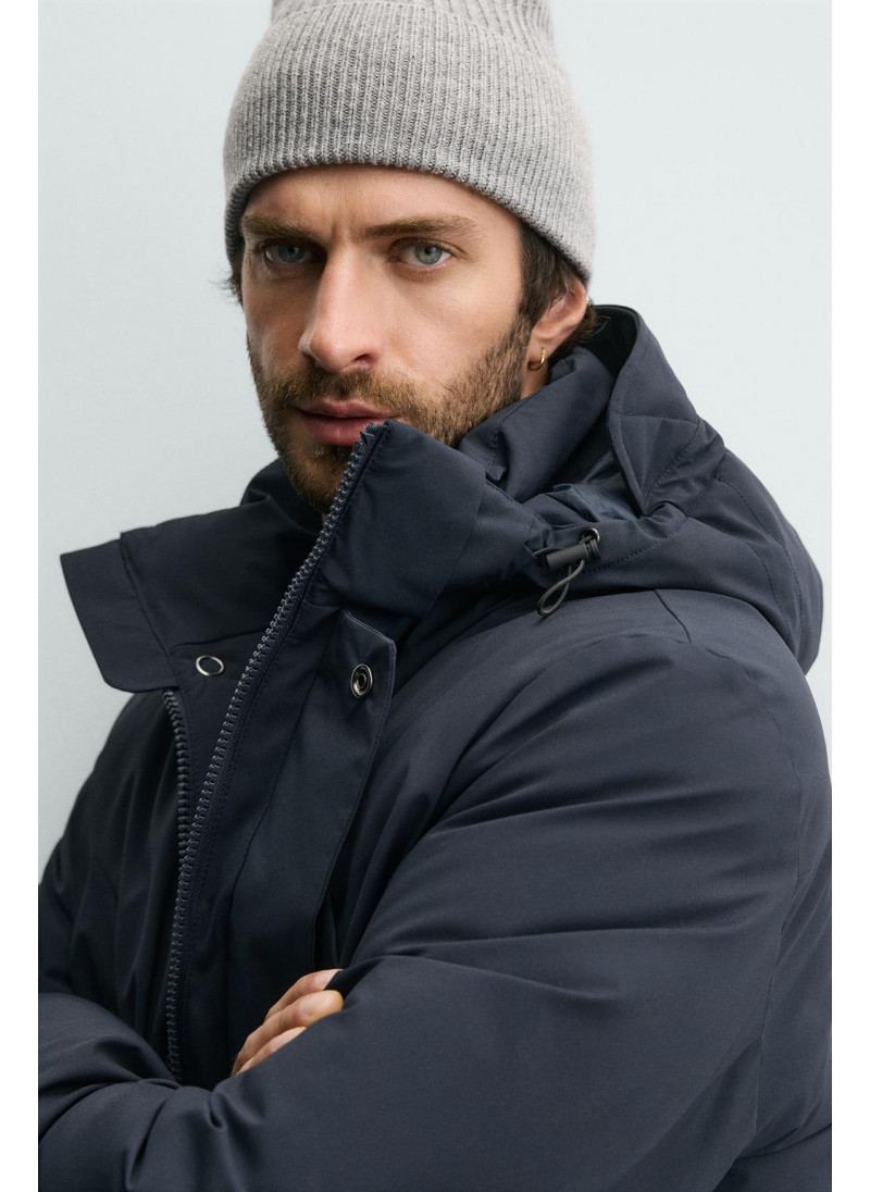 Парка свободного кроя из технической ткани с утепленным интерьером. Высокий воротник с регулируемым капюшоном. Длинные рукава с манжетами в рубчик. Накладные карманы на бедрах и деталь внутреннего кармана. Передняя молния, скрытая планкой с кнопками...