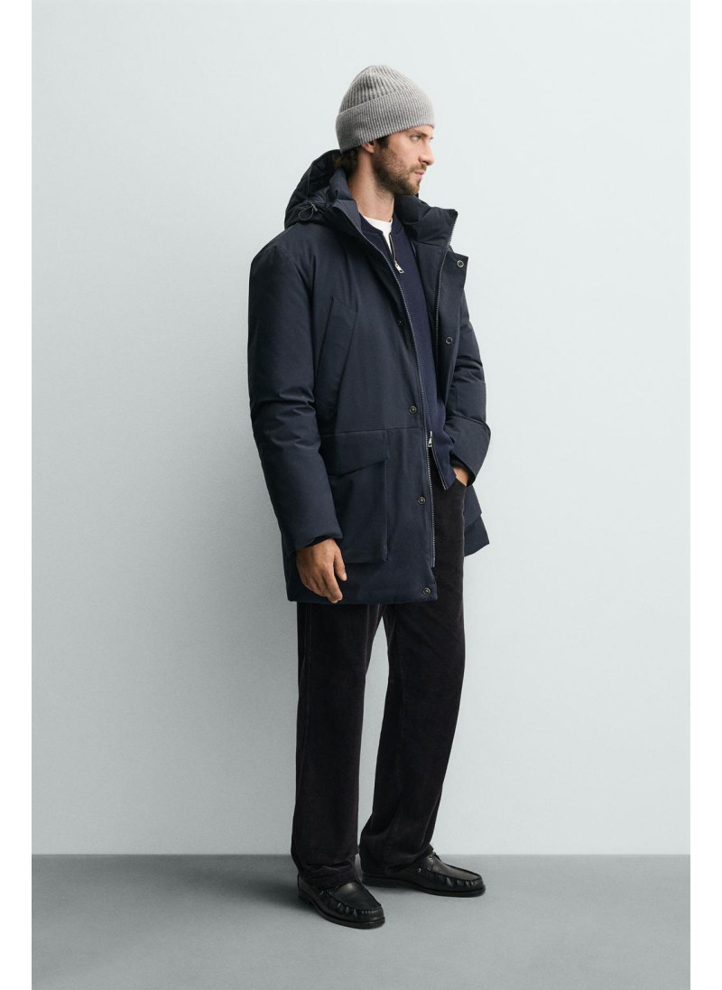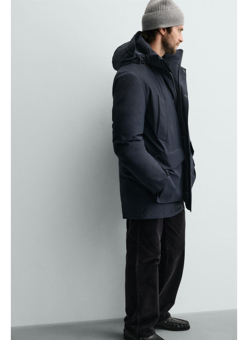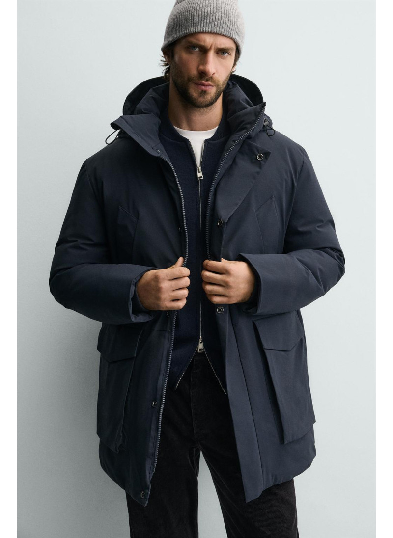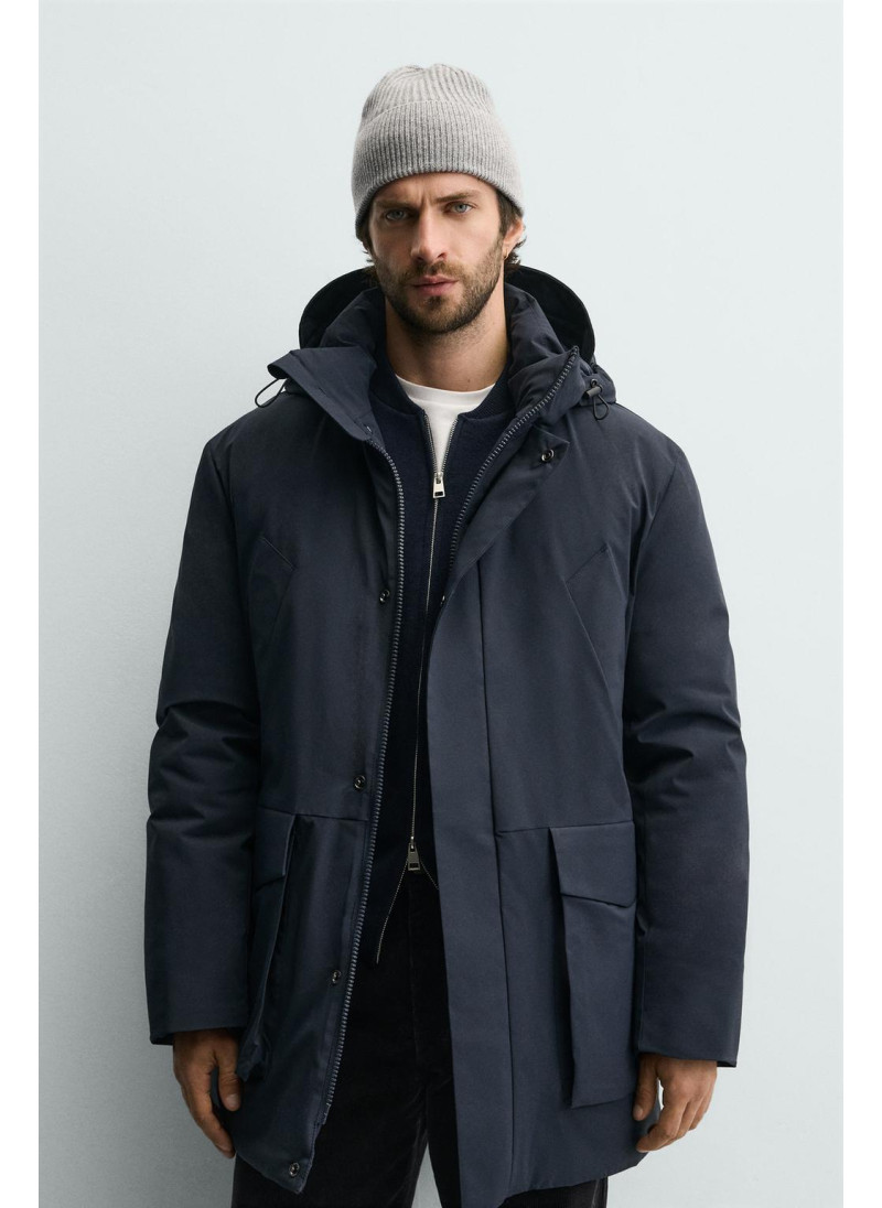 Парка свободного кроя из технической ткани с утепленным интерьером. Высокий воротник с регулируемым капюшоном. Длинные рукава с манжетами в рубчик. Накладные карманы на бедрах и деталь внутреннего кармана. Передняя молния, скрытая планкой с кнопками...