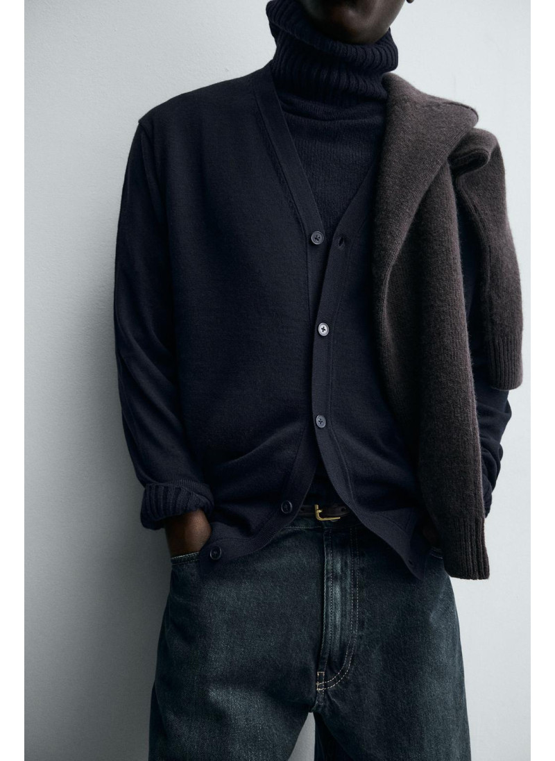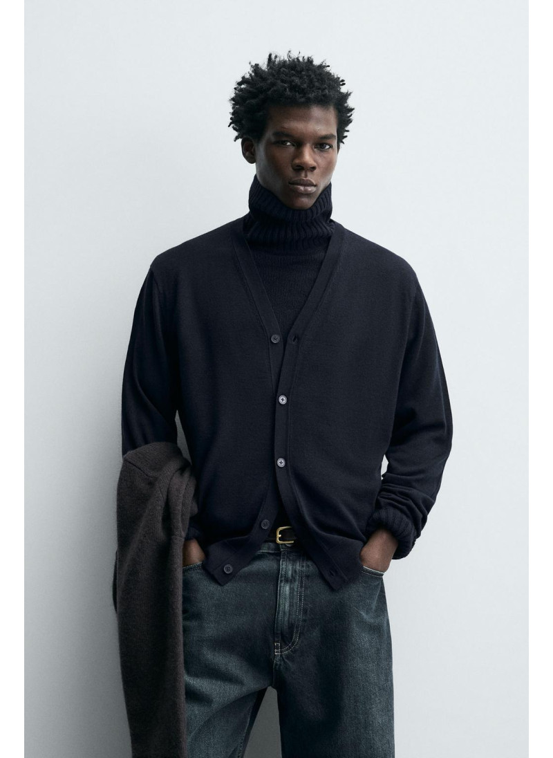 Кардиган классического кроя из легкой шерстяной пряжи. V-образный вырез и длинные рукава. Отделка в рубчик. Застежка на пуговицы спереди.