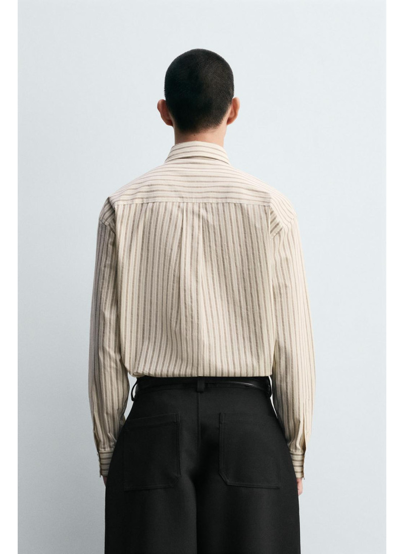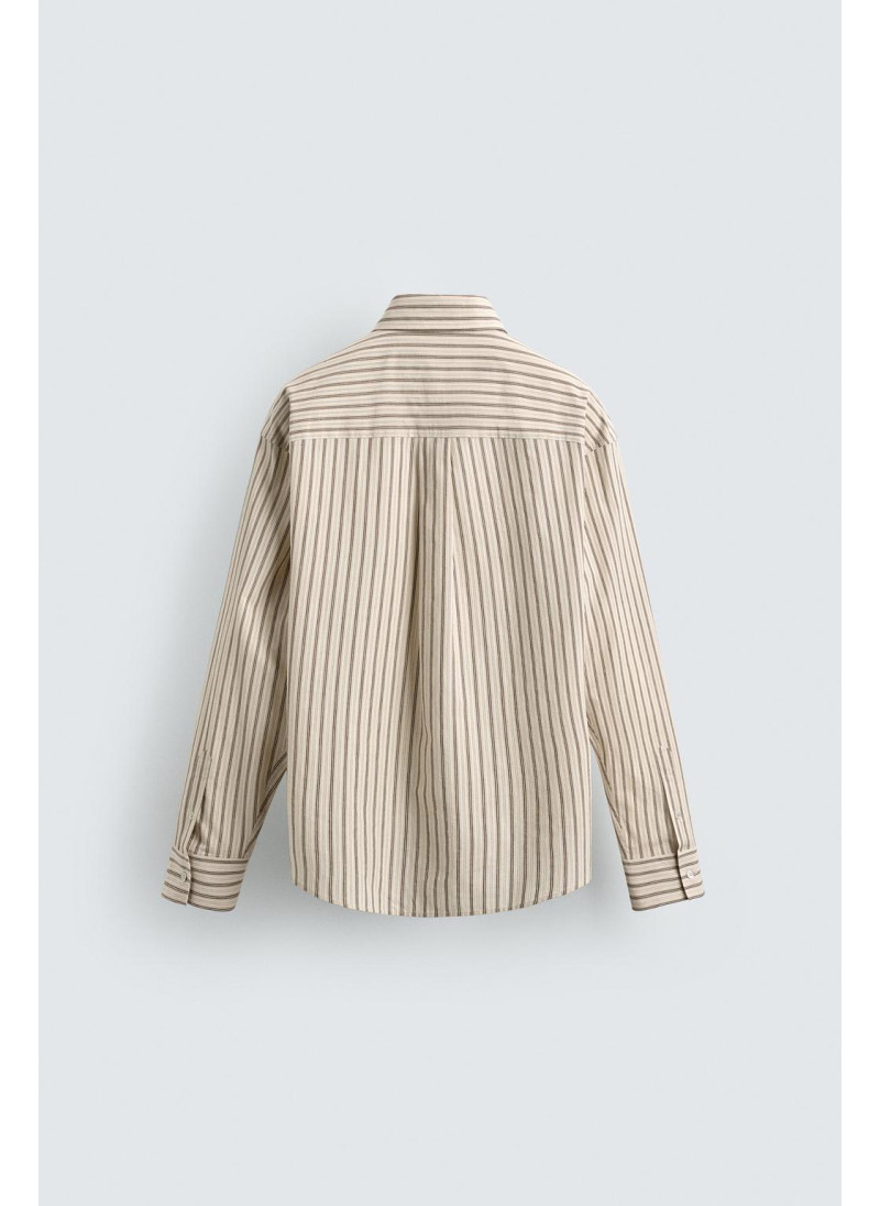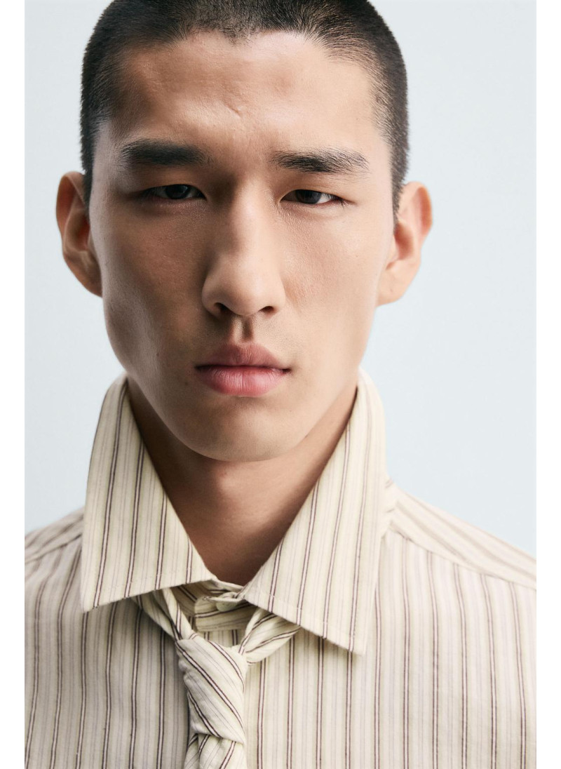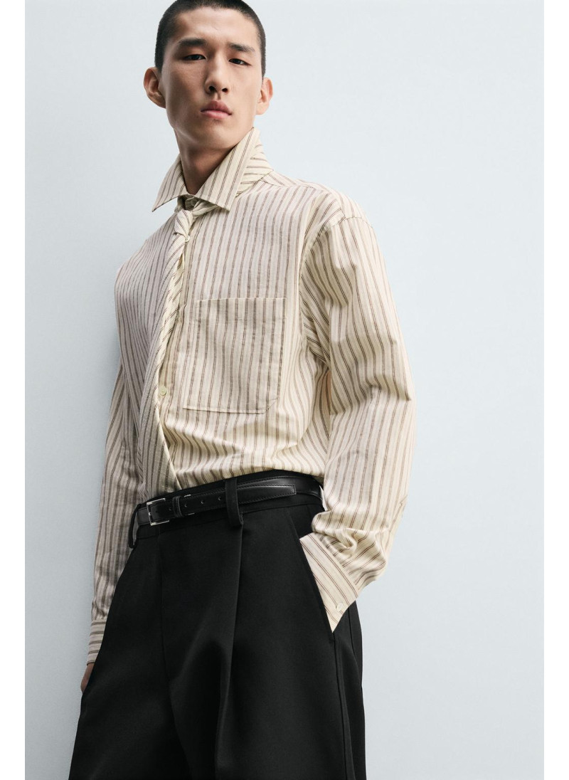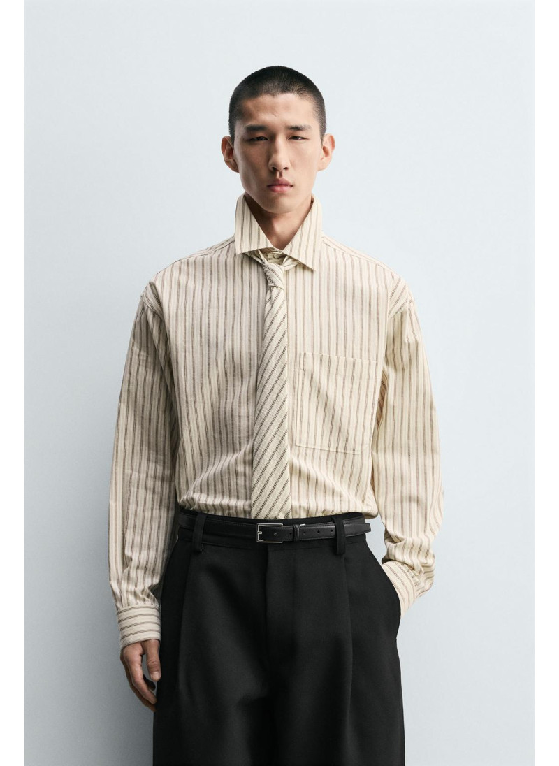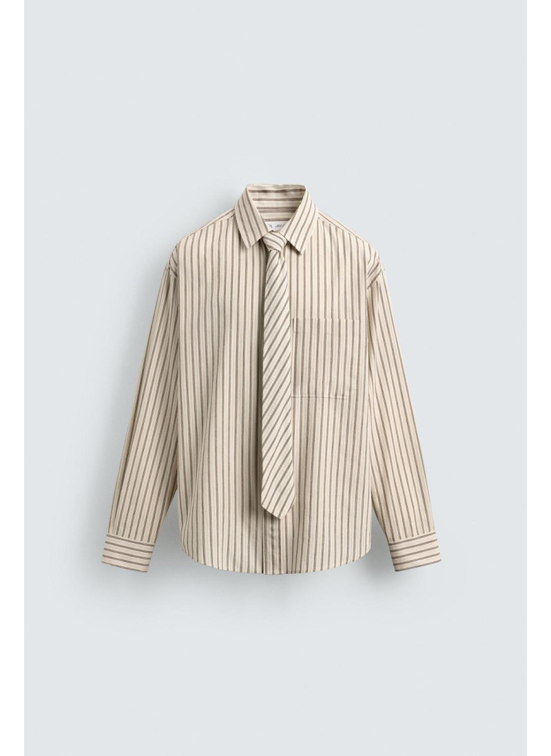 Рубашка из хлопка свободного кроя. Имеет воротник с лацканами и галстук из того же материала. Длинные рукава с пуговицами на манжетах и застежка на пуговицы спереди.