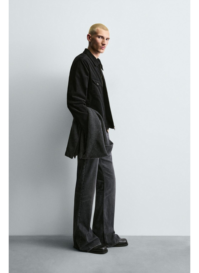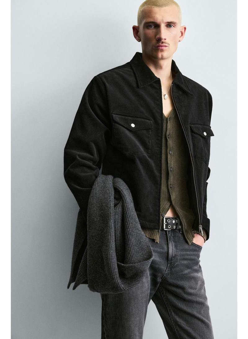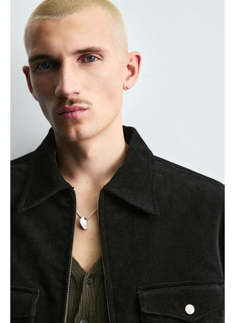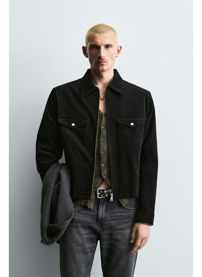 Рубашка в стиле оверсайз из эластичного вельвета. Оснащена воротником с лацканами и длинными рукавами с застежкой на кнопки. Накладные карманы с клапанами на груди и карманы по бокам. Застежка на молнию спереди.