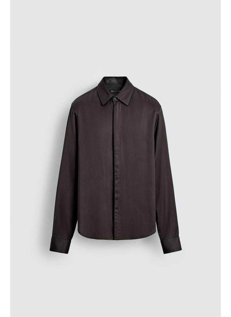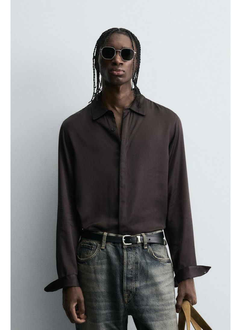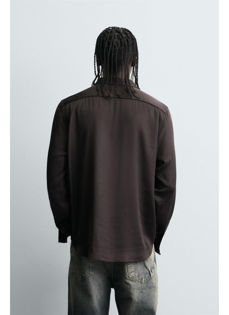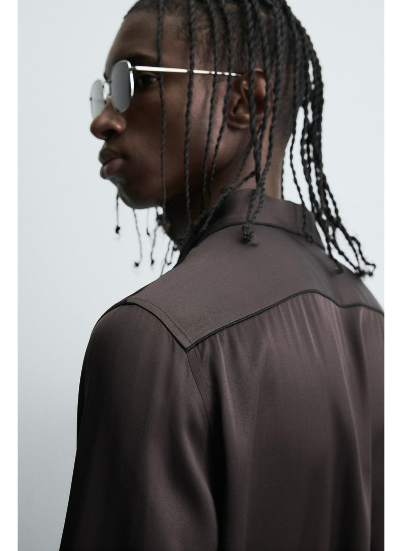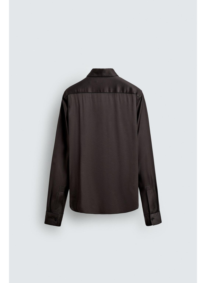 Укороченная рубашка из вискозной ткани с атласным отделкой. Оснащена воротником Джонни и длинными рукавами с застежкой на пуговицы. Завершается контрастными отделками. Застегивается спереди на скрытую планку с пуговицами.