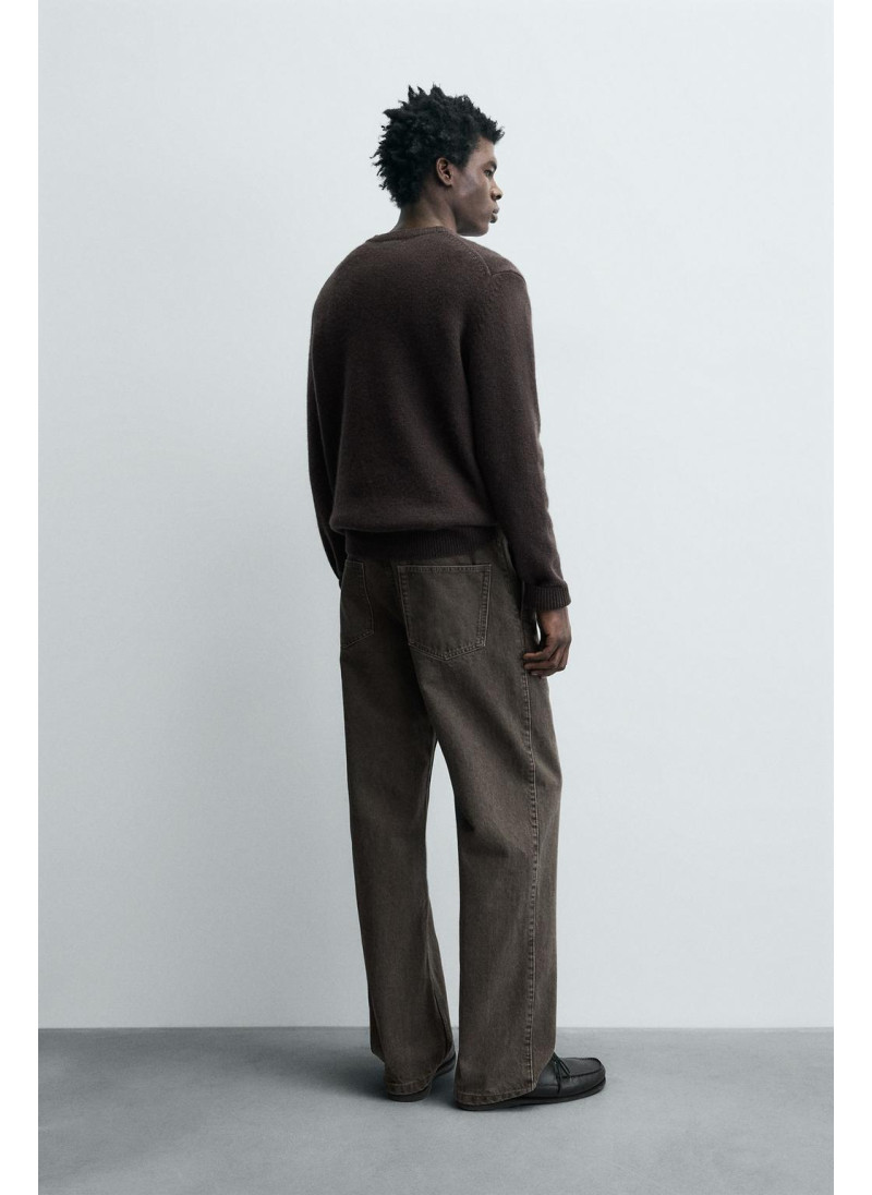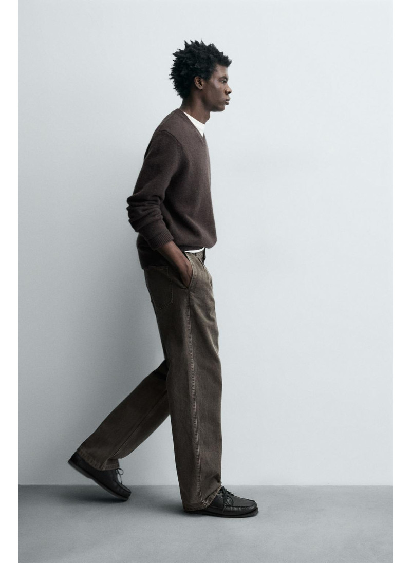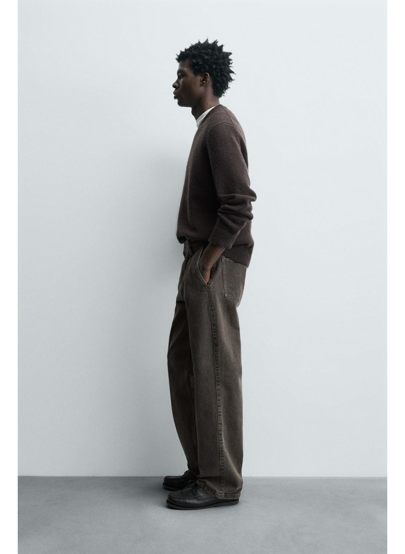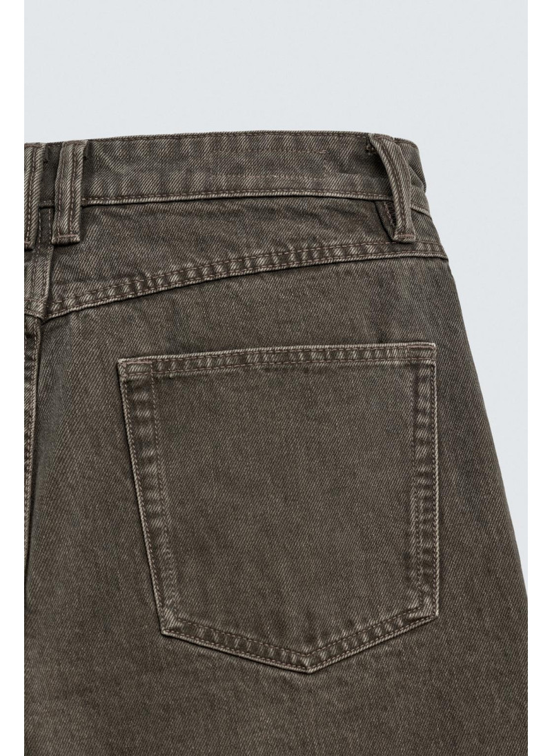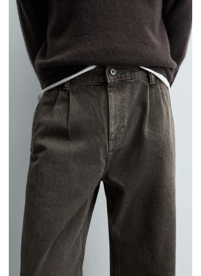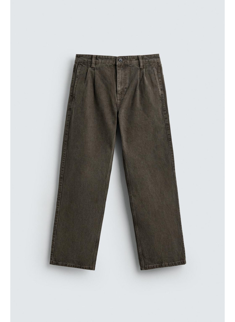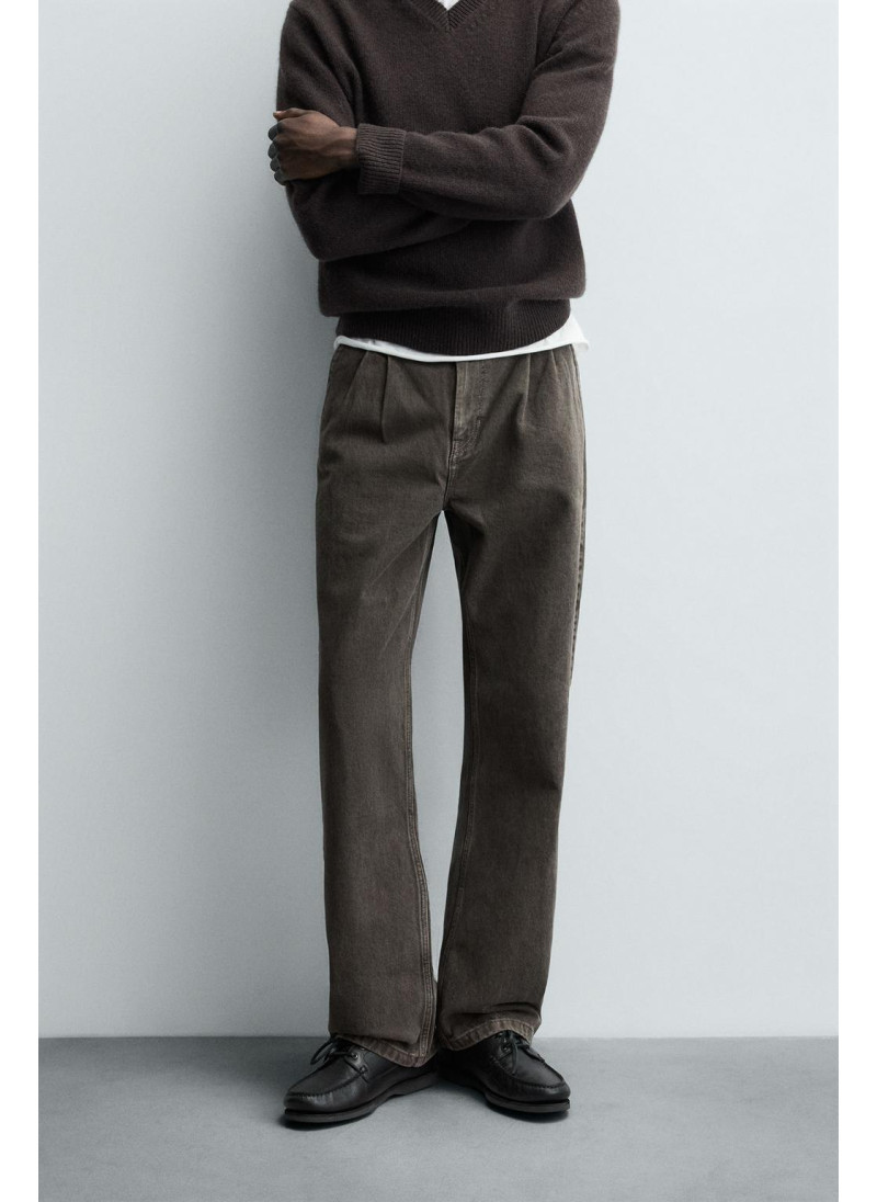 Прямые брюки от бедра до щиколотки, с посадкой, которая не сужается и не расширяется. Средняя посадка. Жесткая ткань. Немного свободнее, чем наша модель Обычные прямые брюки. Пояс со складочными деталями спереди. Пять карманов. Эффект потертости. Застежка на молнию и кнопку спереди...