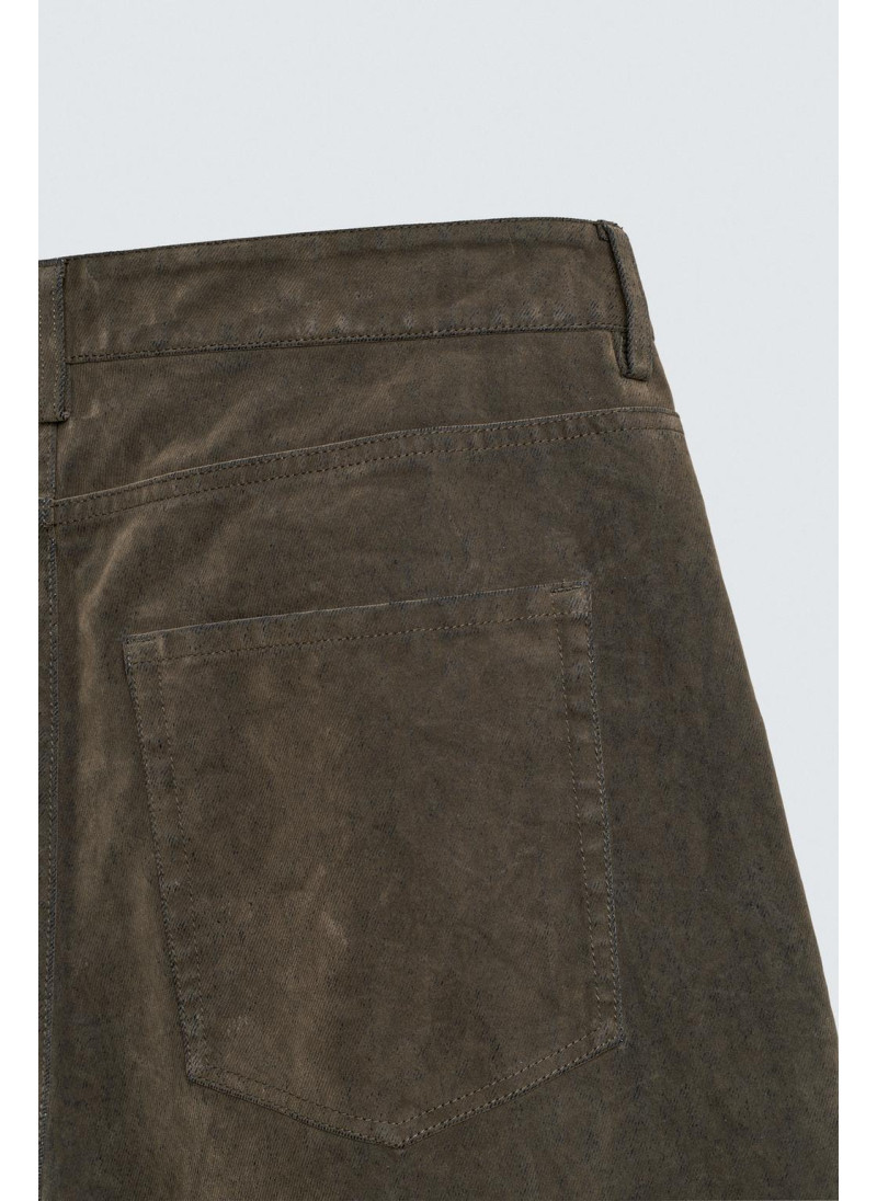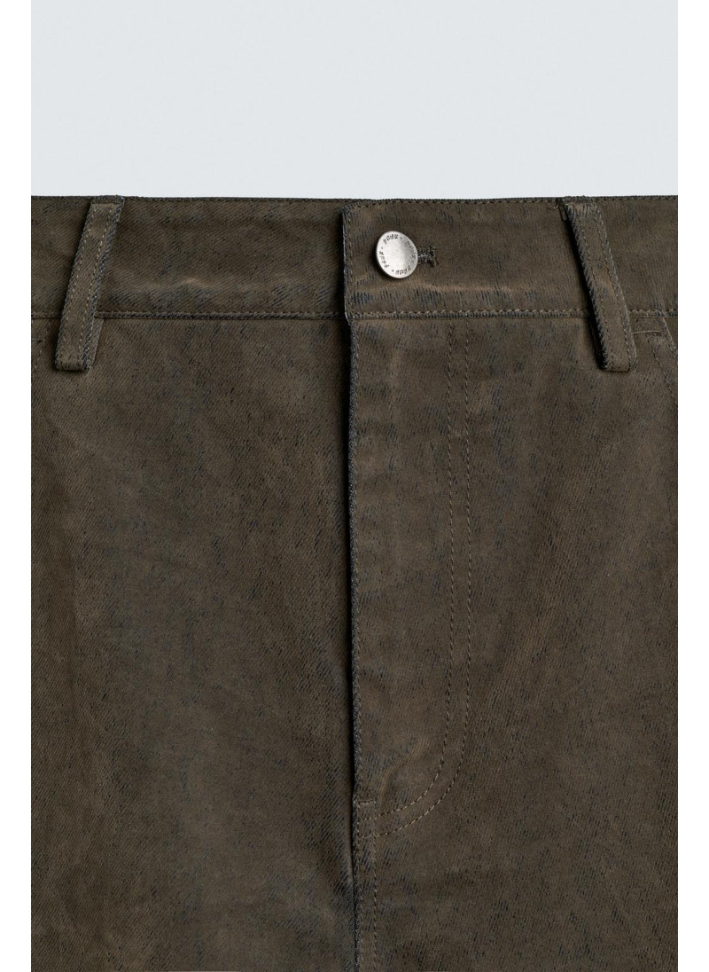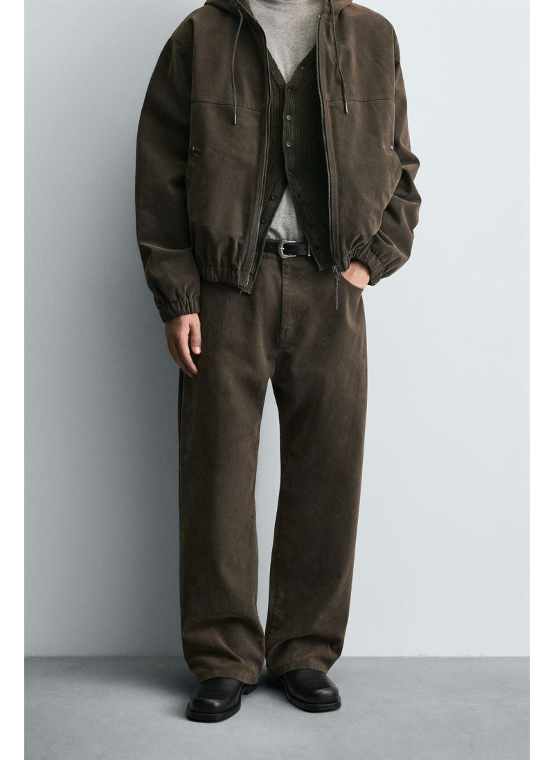 Брюки свободного кроя из хлопковой ткани с бархатистой отделкой. Передние карманы, накладные задние карманы. Эффект потертости. Застегиваются на молнию и пуговицу.