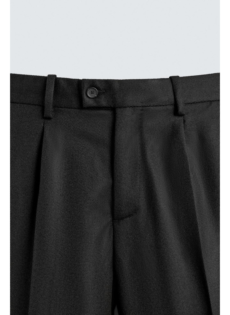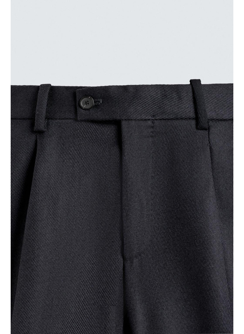 Брюки классического кроя из шерстяной ткани. Пояс с декоративными складками спереди. Передние карманы и задние прорезные карманы. Застежка-молния и пуговица.