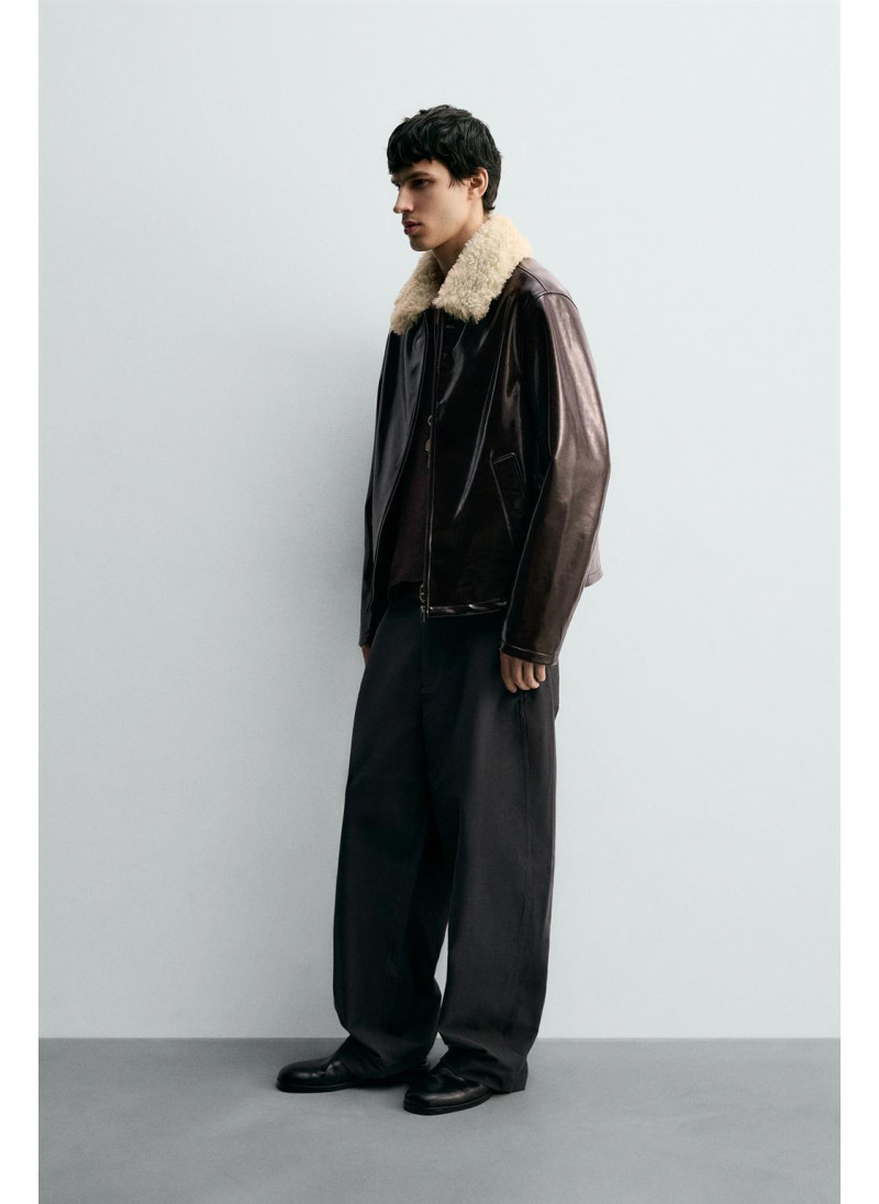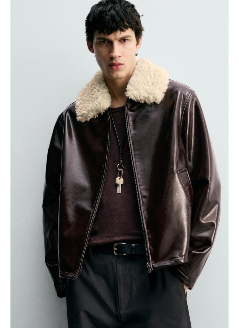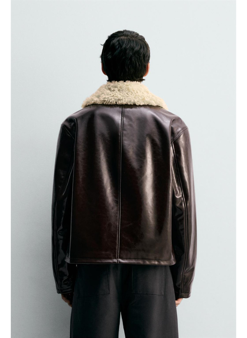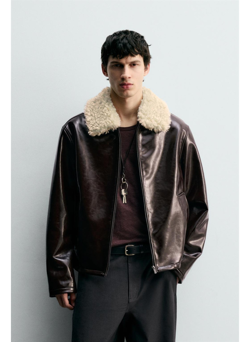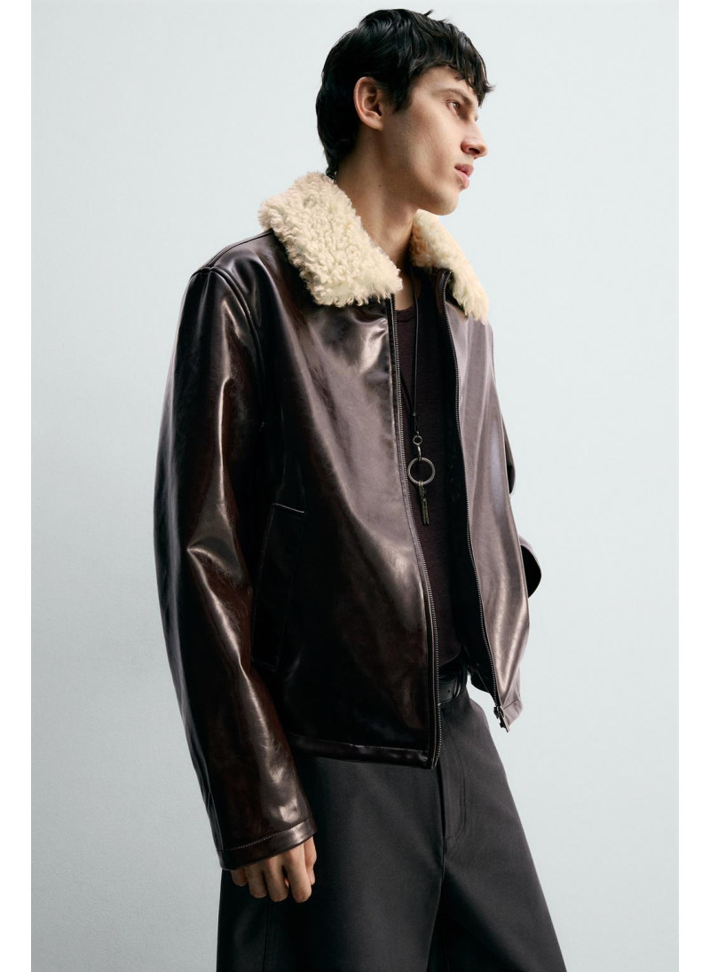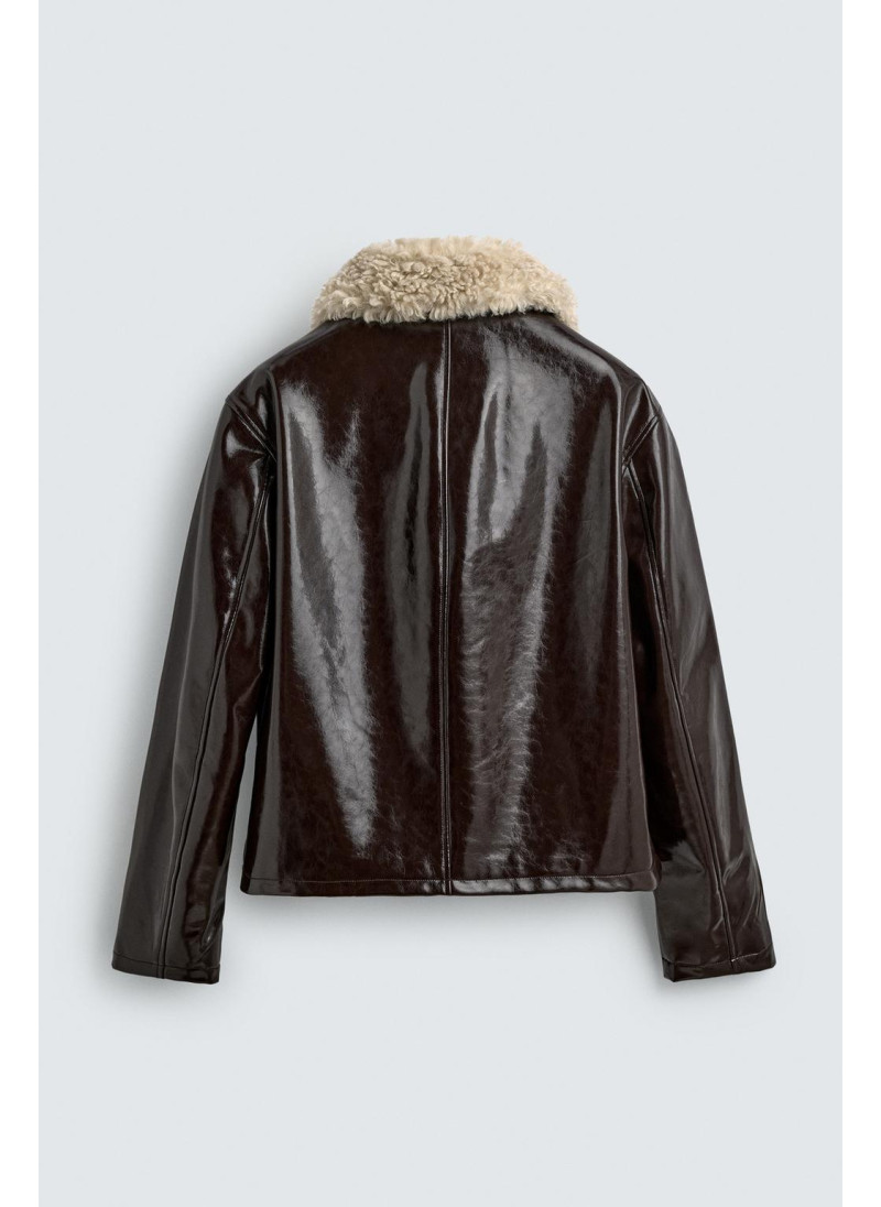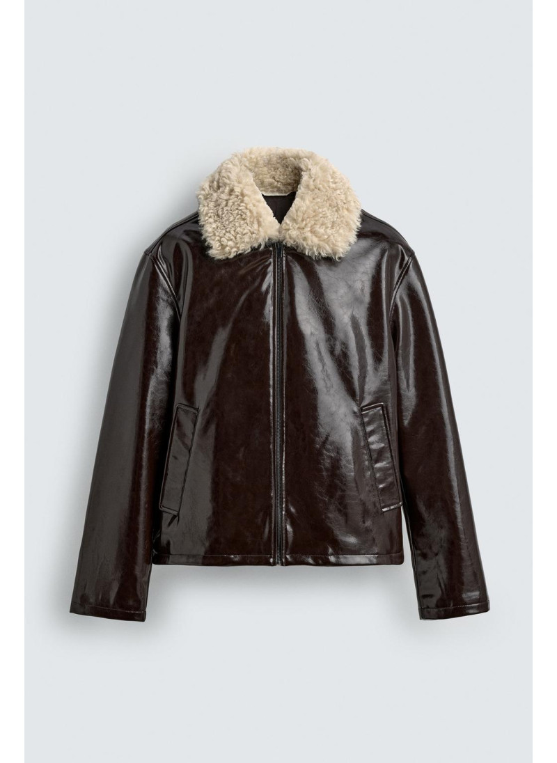 Куртка классического кроя из ткани под кожу с виниловым покрытием. Воротник с лацканами из овчины контрастного цвета. Длинные рукава. Прорезные карманы на бедрах и внутренний карман. Застежка-молния спереди.