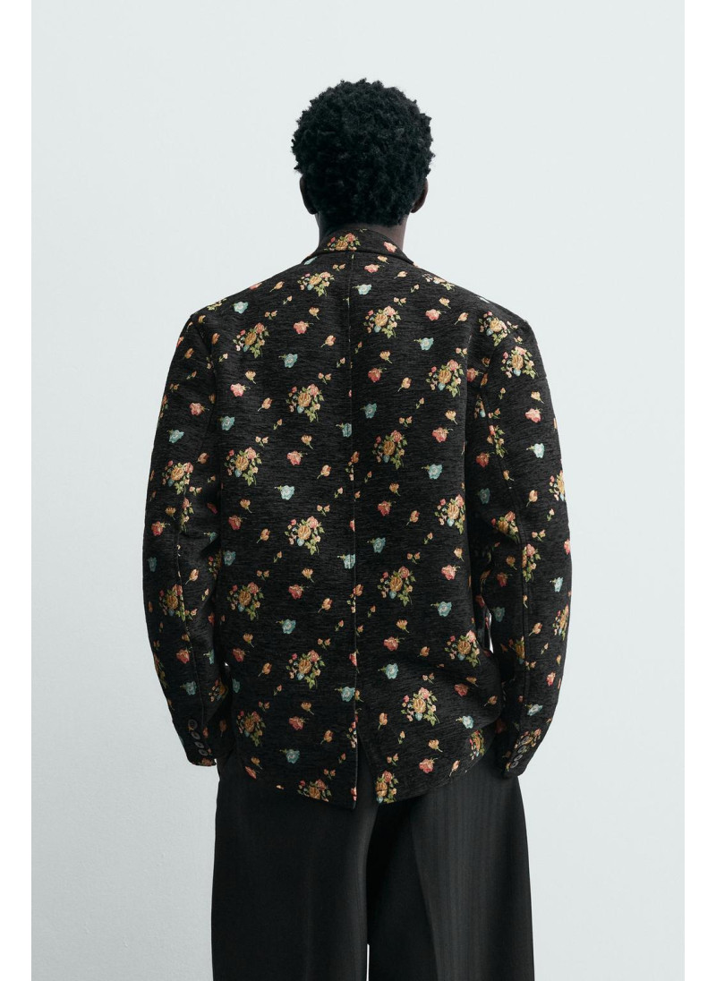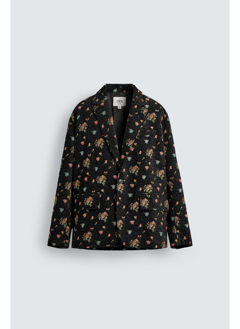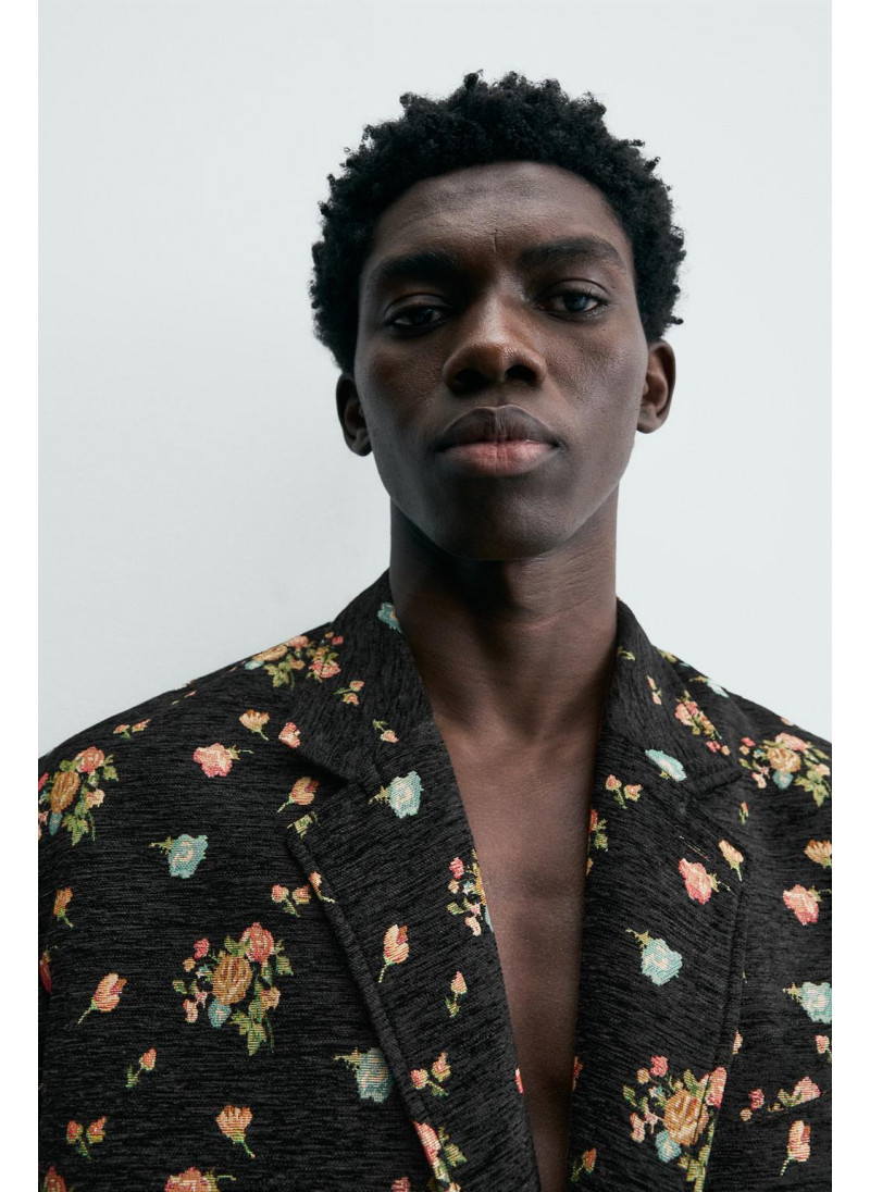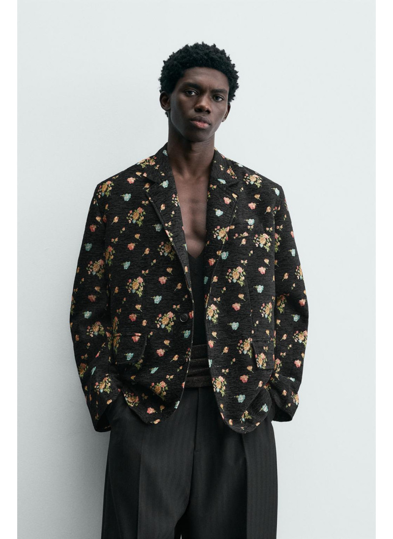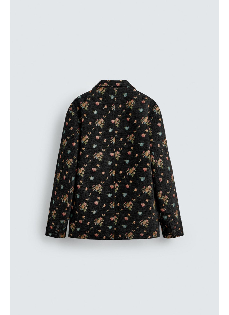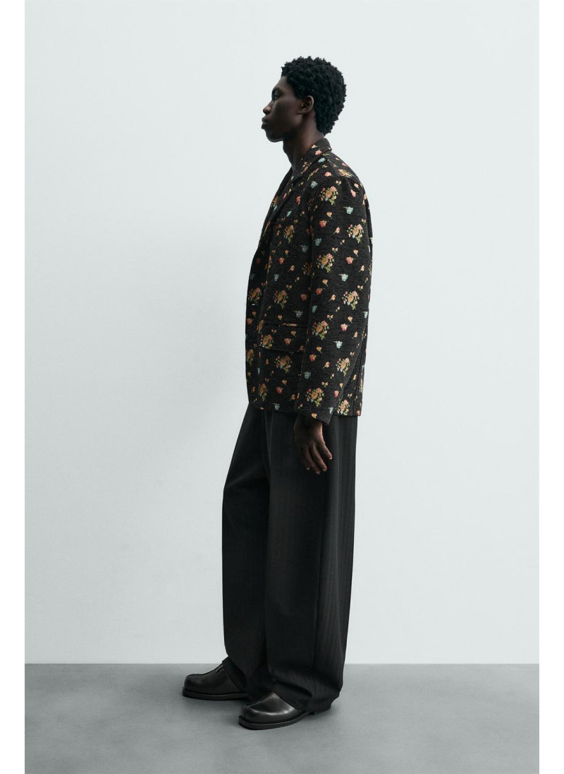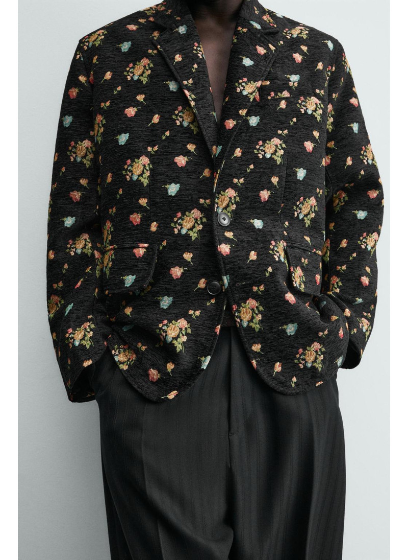 Пиджак свободного кроя из ткани с контрастными комбинированными структурами. Имеет лацкан воротник и длинные рукава с пуговицами на манжетах. Нагрудный карман с клапаном и карманы с клапанами на бедрах. Деталь внутреннего кармана. Низ изделия с разрезом по центру спинки. Застежка спереди на пуговицы...