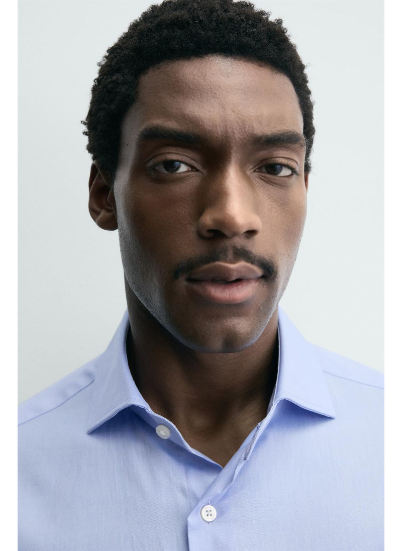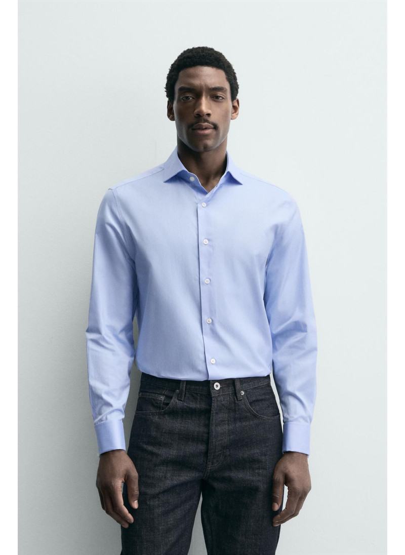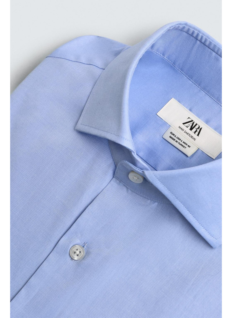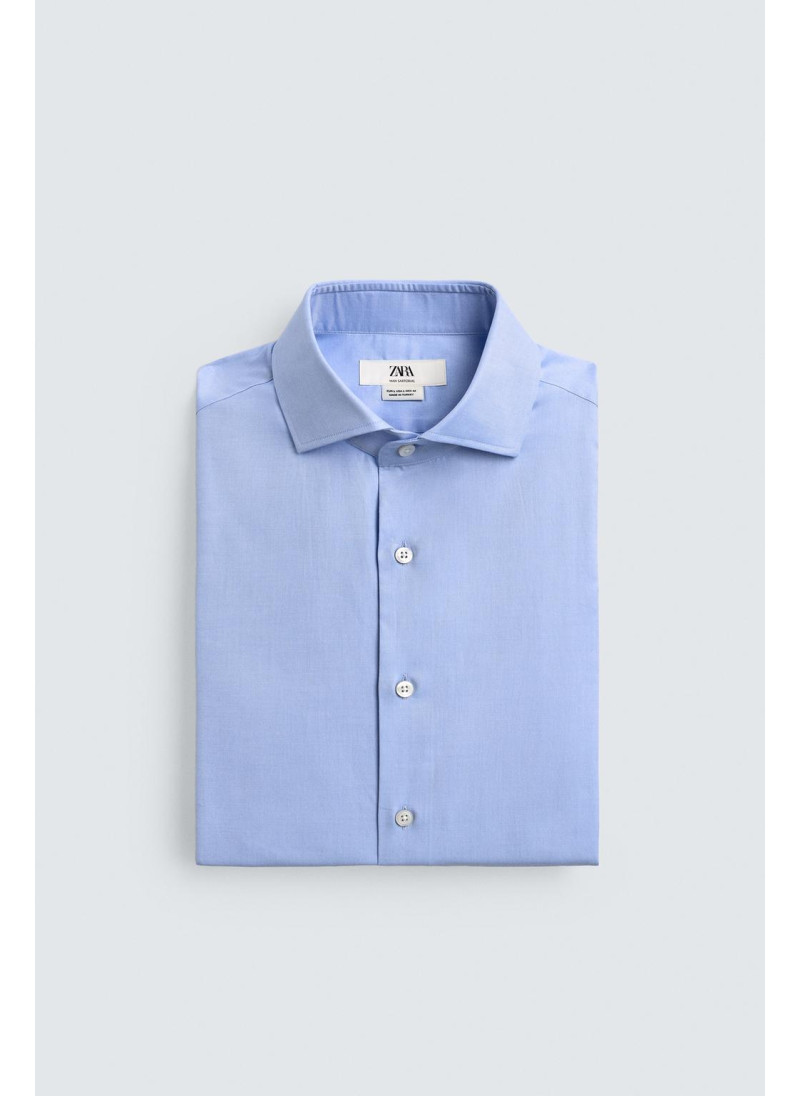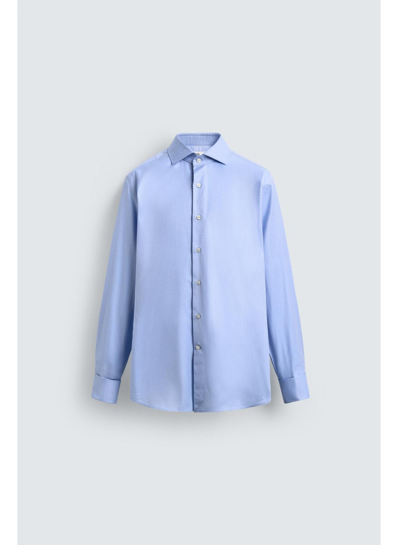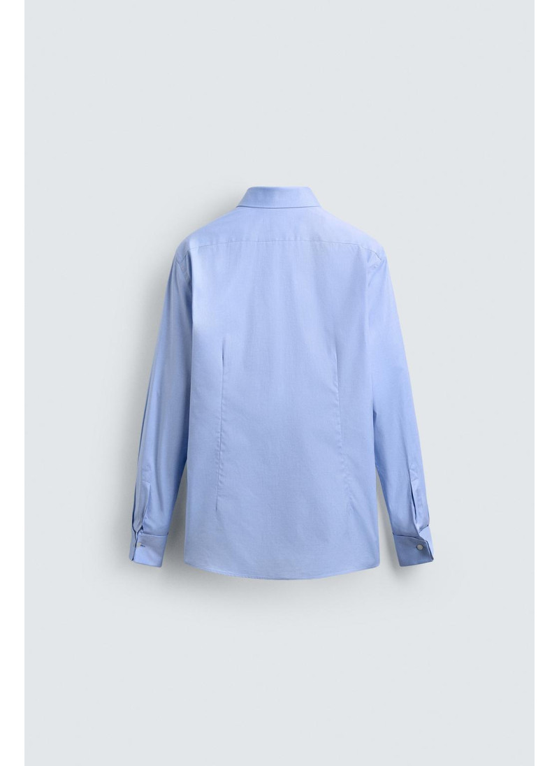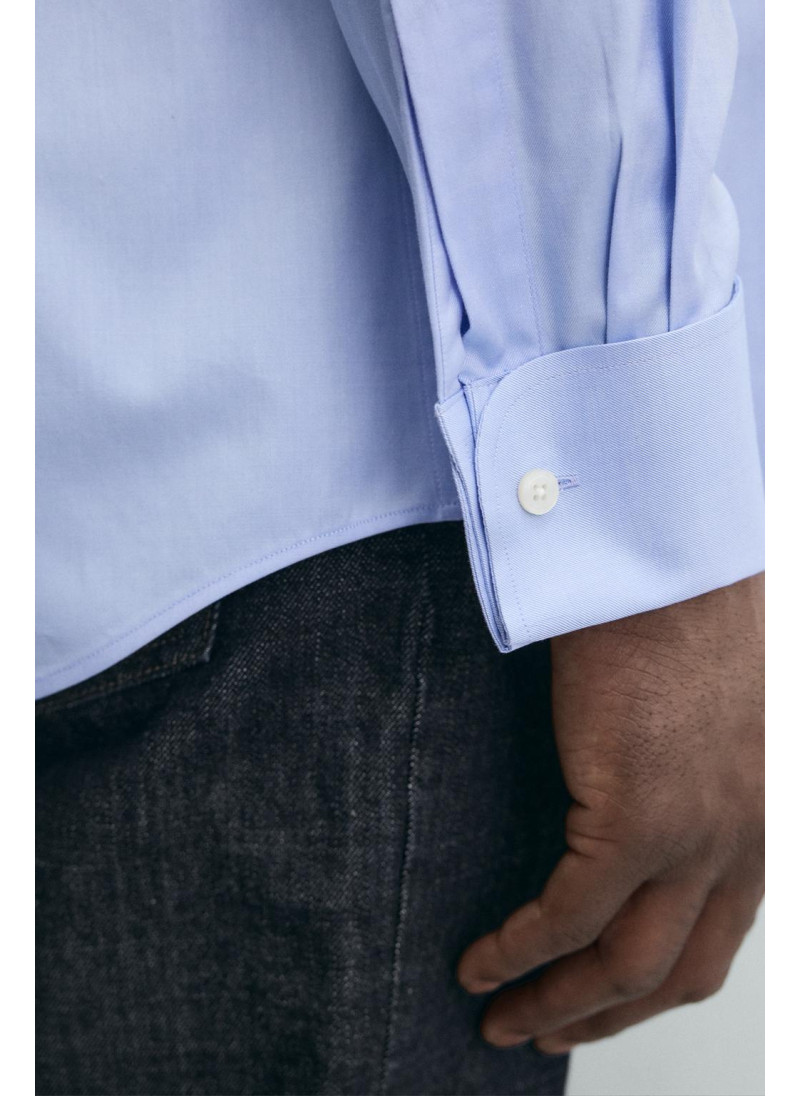 Рубашка классического кроя из хлопка. Открытый широкий воротник. Длинные рукава с двойными манжетами под запонки. Застегивается на пуговицы.