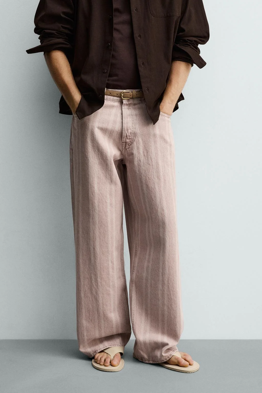 Relaxed fit jeans made from cotton denim. Five pockets. Washed effect striped print. Zip fly and button fastening.