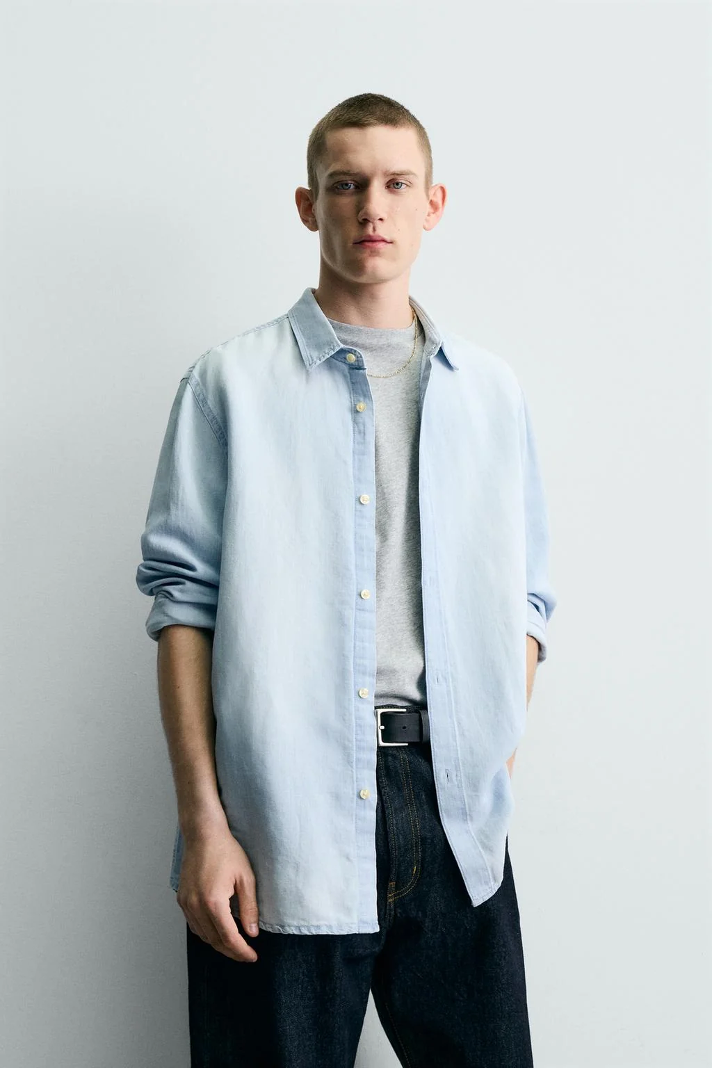 Свободного кроя рубашка из легкого денима с добавлением льна и хлопка. С классическим воротником, длинными рукавами с застежкой на пуговицы, эффектом выцветания и застежкой спереди на пуговицы.