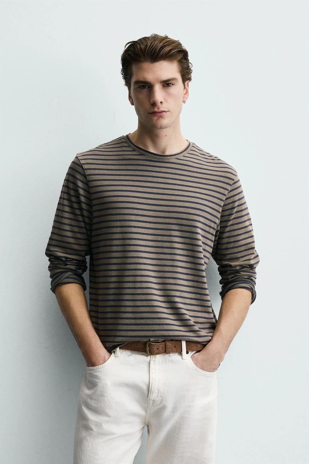 Свободный крой футболки. Круглый вырез горловины и длинные рукава. Эффект вымытости.