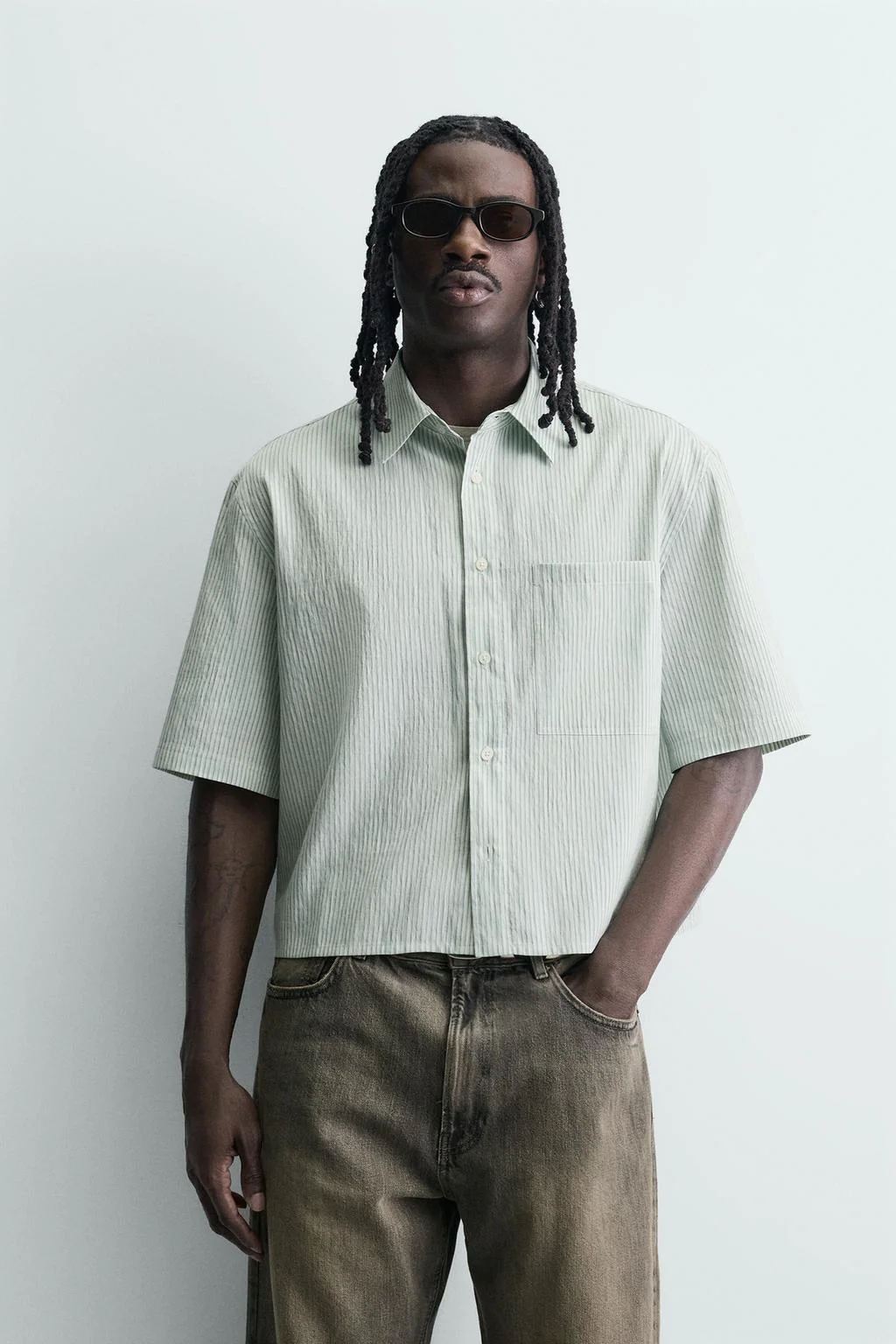 Укороченная рубашка с приталенным силуэтом. Стоячий воротник и короткие рукава. Накладной карман на груди. Застежка на пуговицы.