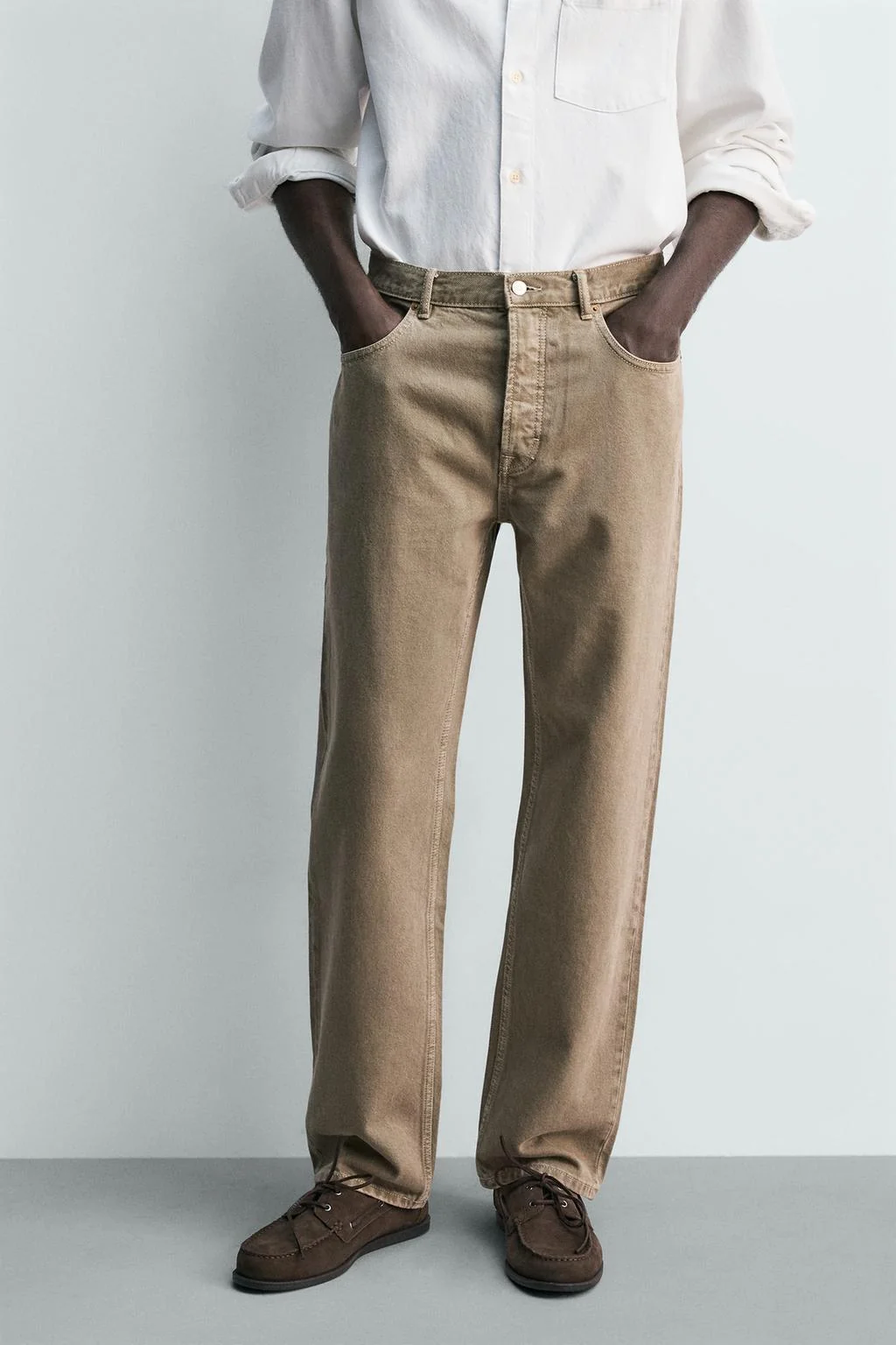Slightly looser than our Regular Straight Fit model. Five pockets. Faded effect. Front zip and button fastening.