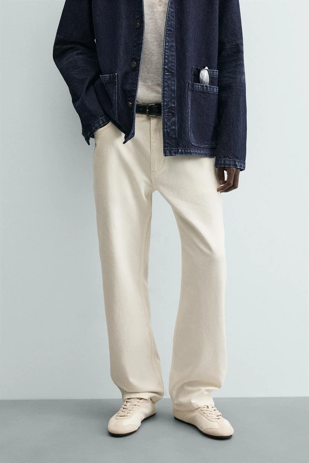 Прямые джинсы из денима, состоящего из смеси хлопка и конопли. Пять карманов. Выцветшая стирка. Застежка спереди на молнию и пуговицу.