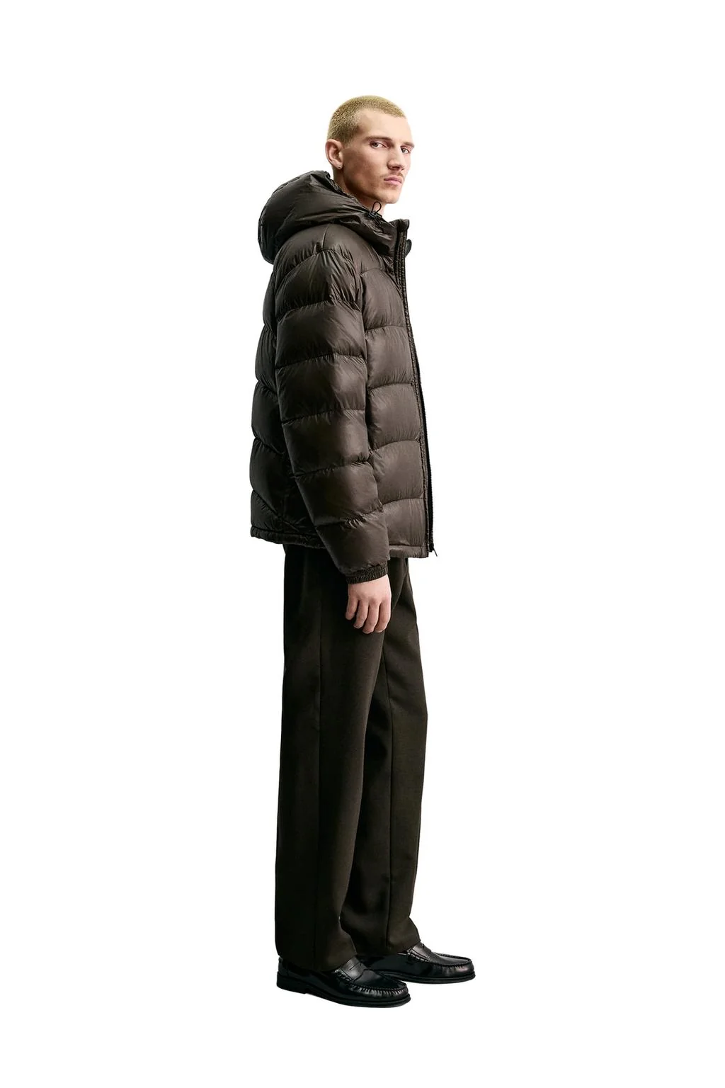 Высокий воротник с капюшоном, длинные рукава с эластичными манжетами. Карманы на молнии, скрытые под обтачками на бедрах, и внутренний карман. Регулируемый подол с эластичными вставками по бокам. Молния по передней части.