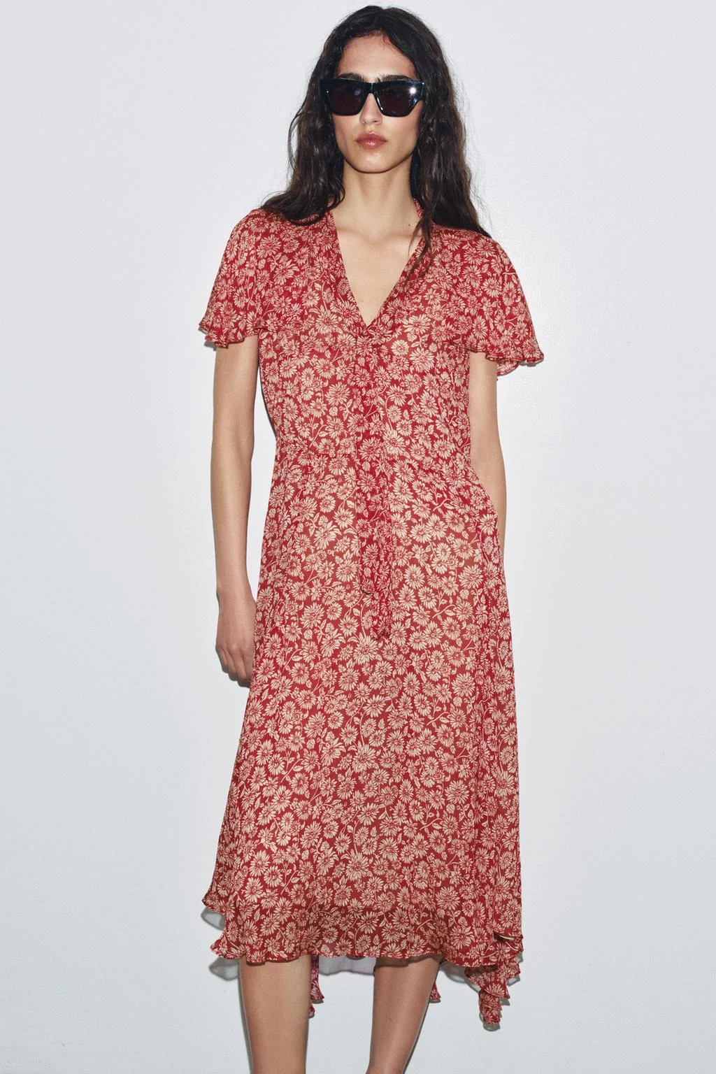 Платье миди с основной тканью из вискозы. V-образный вырез с завязками и короткие рукава. Асимметричный подол.