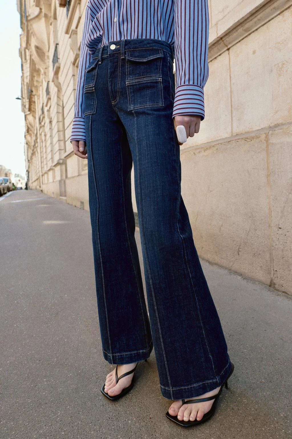 Джинсы высокой посадки с нашивными карманами спереди и сзади. Имеют выраженную переднюю строчку и расклешенные манжеты. Молния и пуговица на застежке спереди.