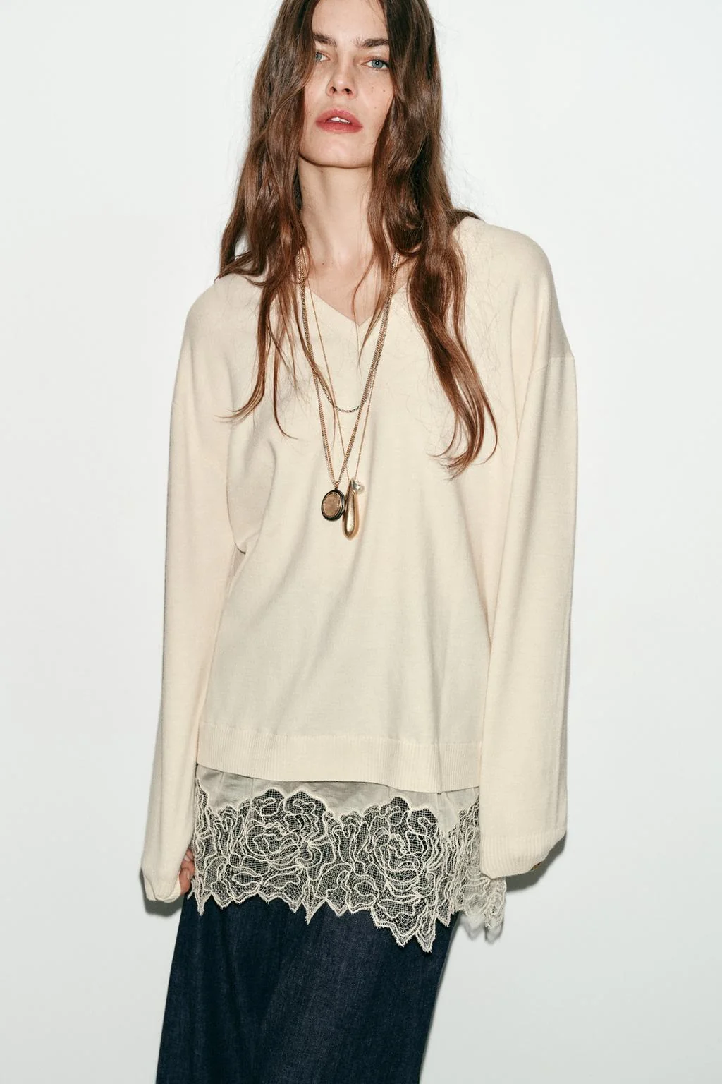 Длинный свитер из трикотажа с кружевными деталями — Zara — ЗараТут