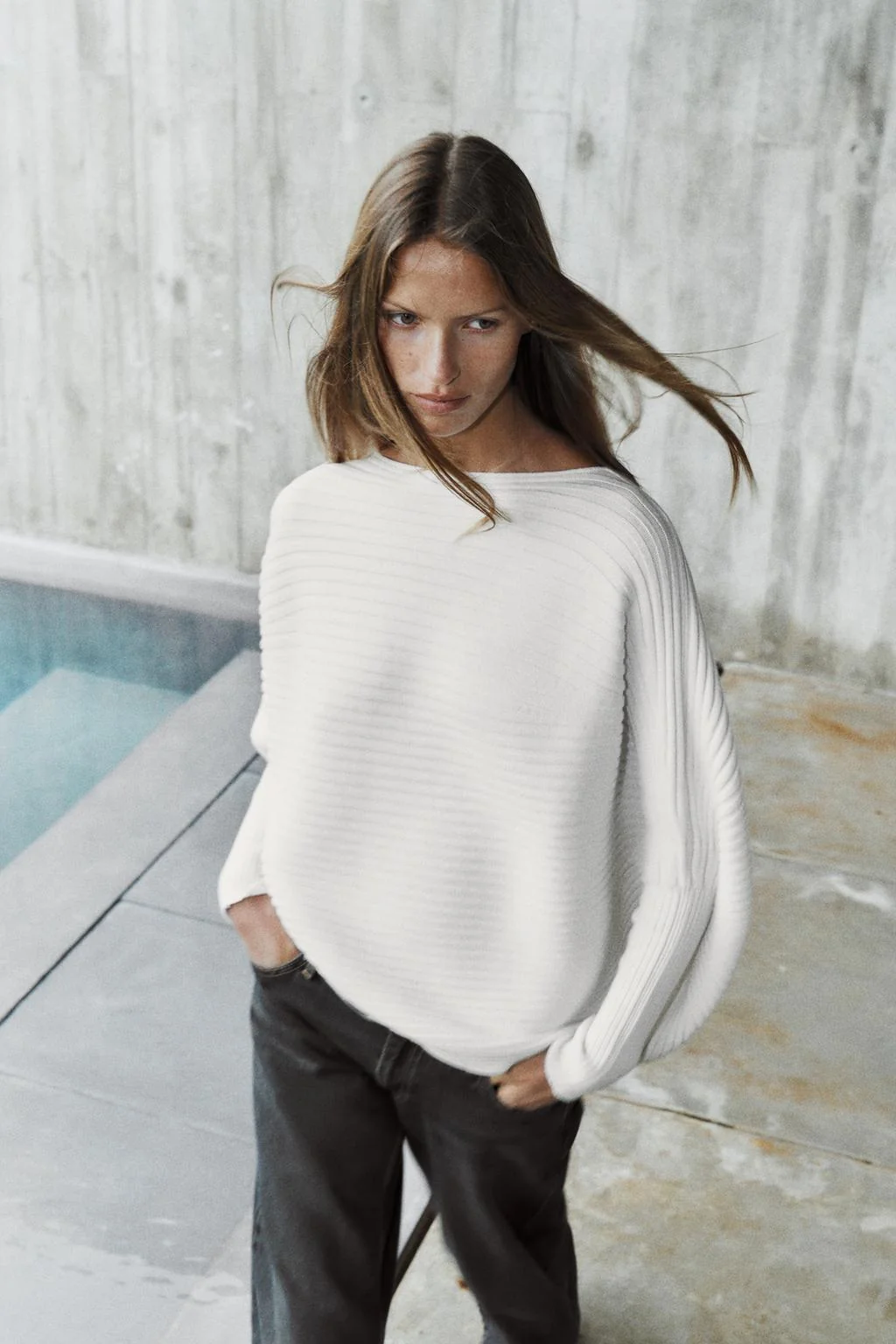 Свитер с лодочкой и длинными рукавами с широкими проймами, сужающимися к запястью.