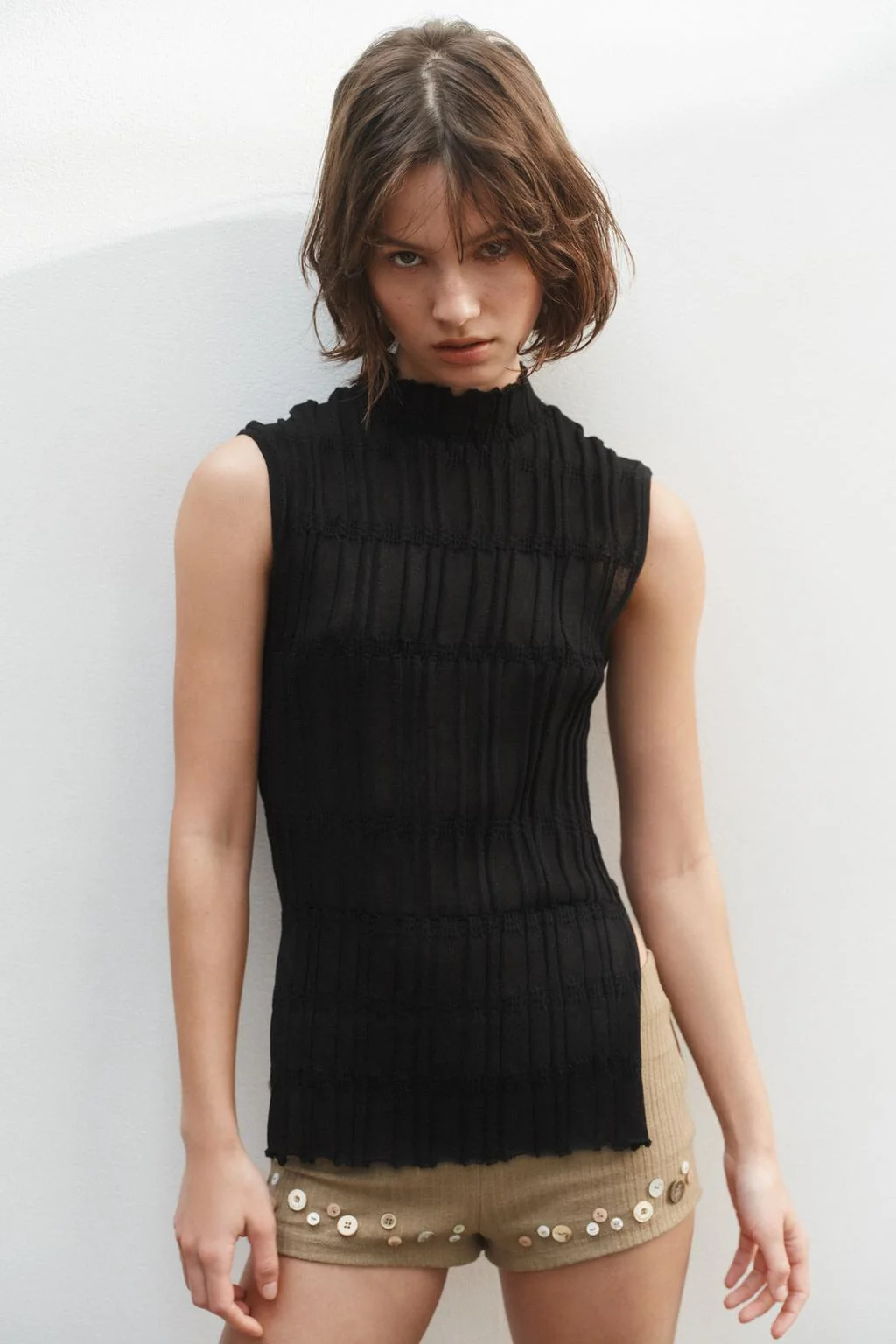 Топ из тонкого трикотажа с высоким воротником и без рукавов. Имеет боковые прорези у подола.