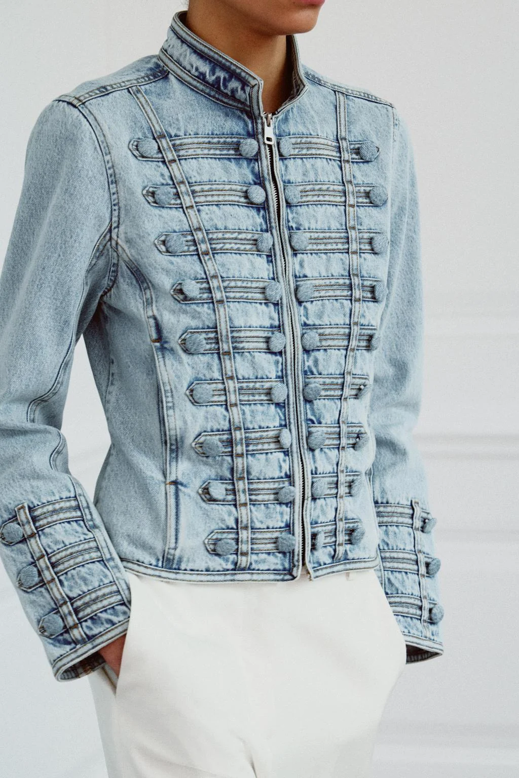 Jacket with main fabric made from cotton yarn. Round neck and long sleeves. Concealed front pockets in seams. Button detail and appliqué with same fabric on the front. Washed effect. Front fastening with metal zip.