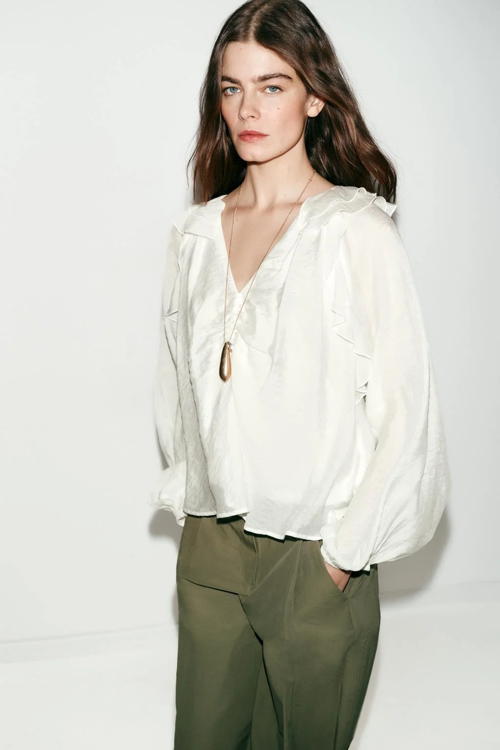 Блузка с V-образным вырезом, собранная в талии и с длинными рукавами. С воланами.