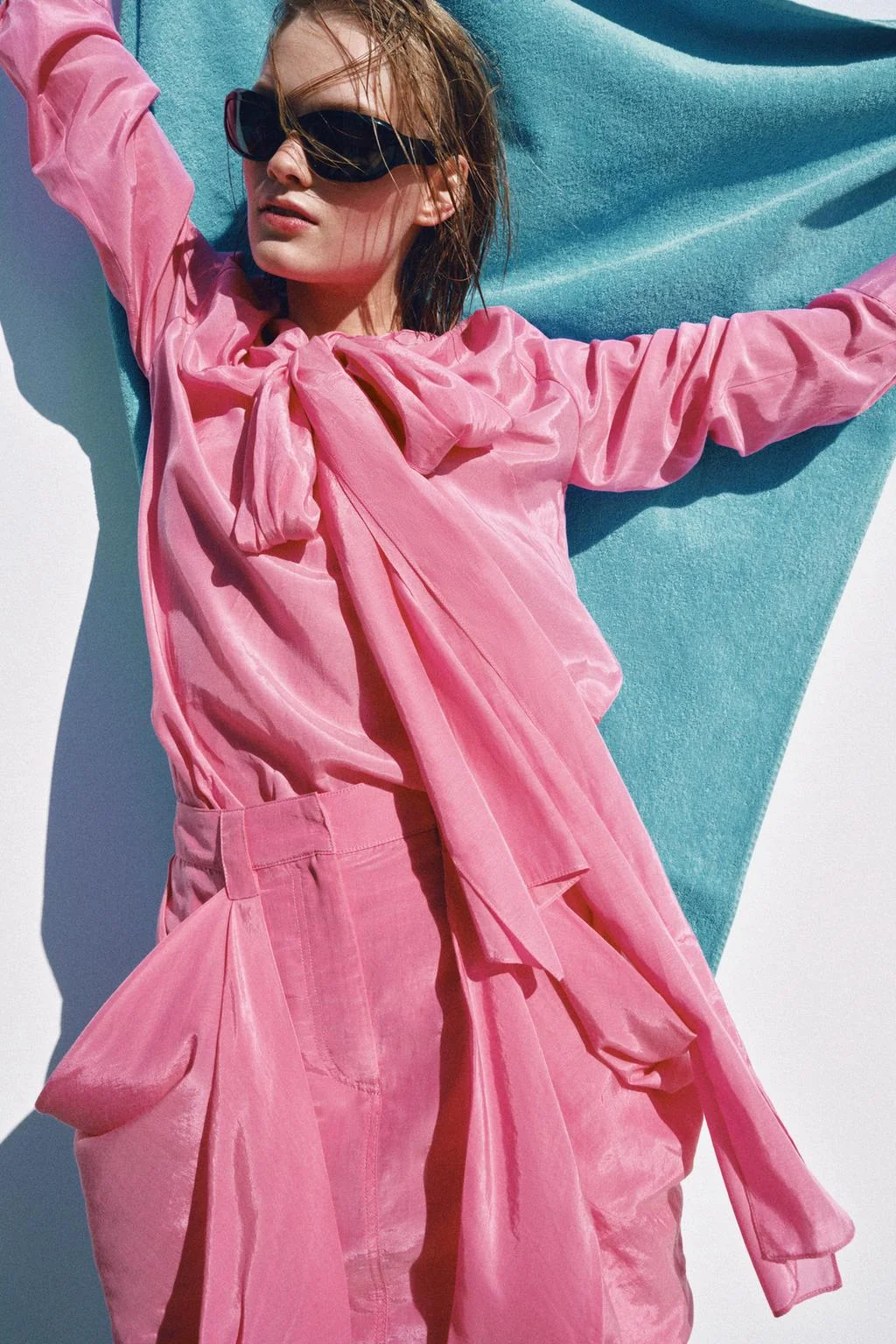 Blouse made of spun viscose and cotton. Round neck adjustable with matching fabric ties. Long sleeves with cuffs. Asymmetric hem with side vents.