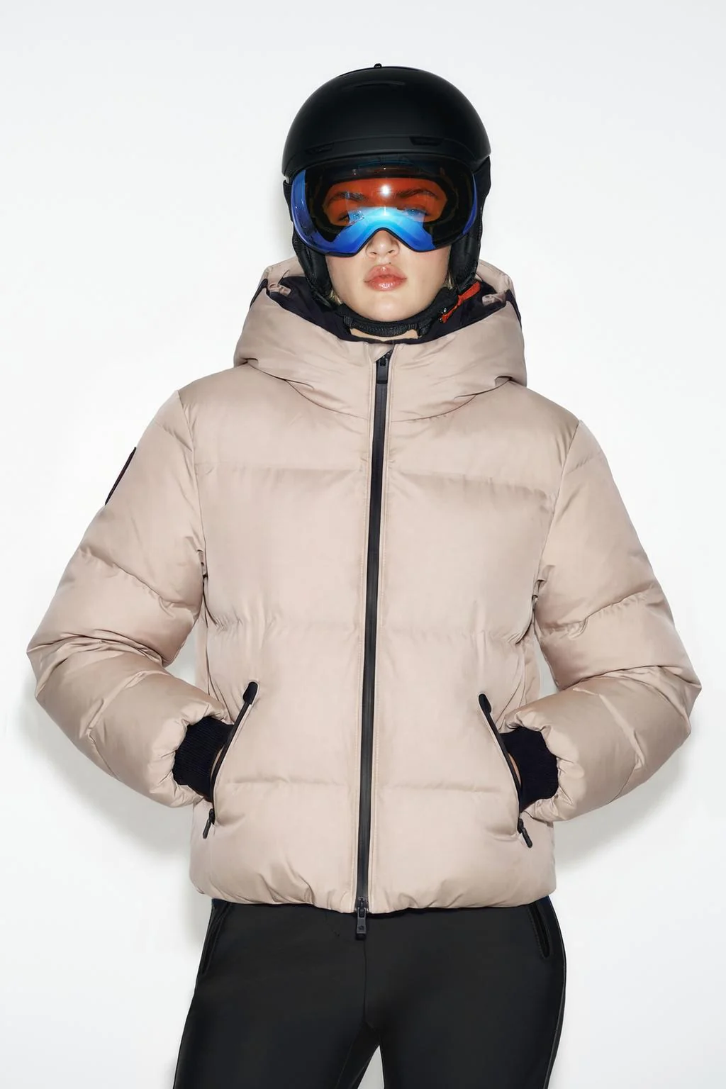 Высокий воротник с регулируемой капюшоном на молнии. Длинные рукава с карманом для ски-пасса, завершаются резинкой и манжетами с отверстиями для больших пальцев. Регулируемая вентиляция в подмышках с скрытой молнией. Передние карманы с внутренней флисовой подкладкой и застежкой на молнию. Внутренний карман для мобильного телефона и сетчатый карман для перчаток с салфеткой для очков. Нижний край завершается резинкой с регулируемыми шнурками. Съемная внутренняя юбка с молнией и регулируемым краем для предотвращения попадания холодного воздуха. Передние застежки с двойной молнией и внутренней флисовой планкой для защиты лица.