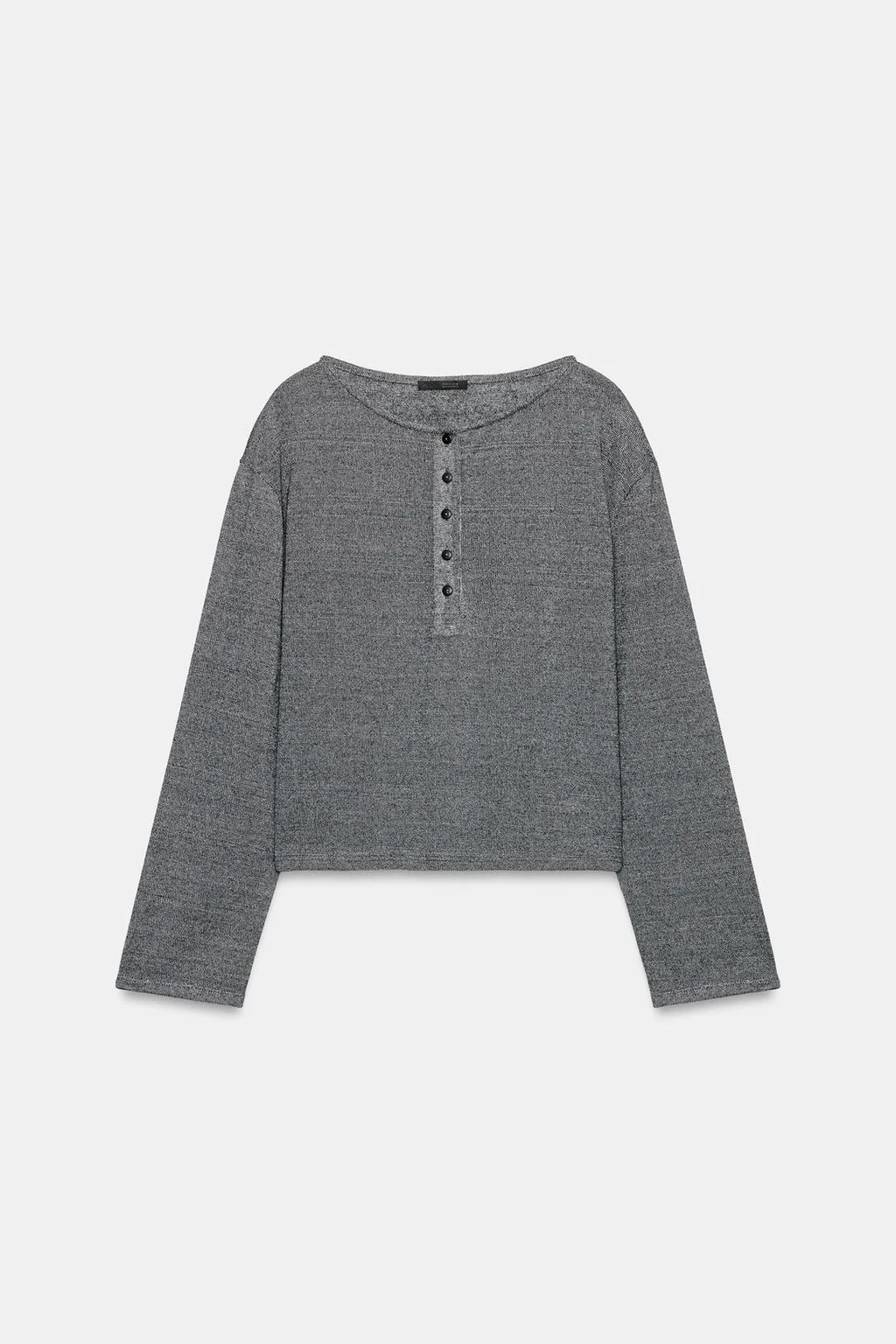 T-shirt made from a rustic fabric. Featuring a round neck, long sleeves, a straight hem, and front button fastening.