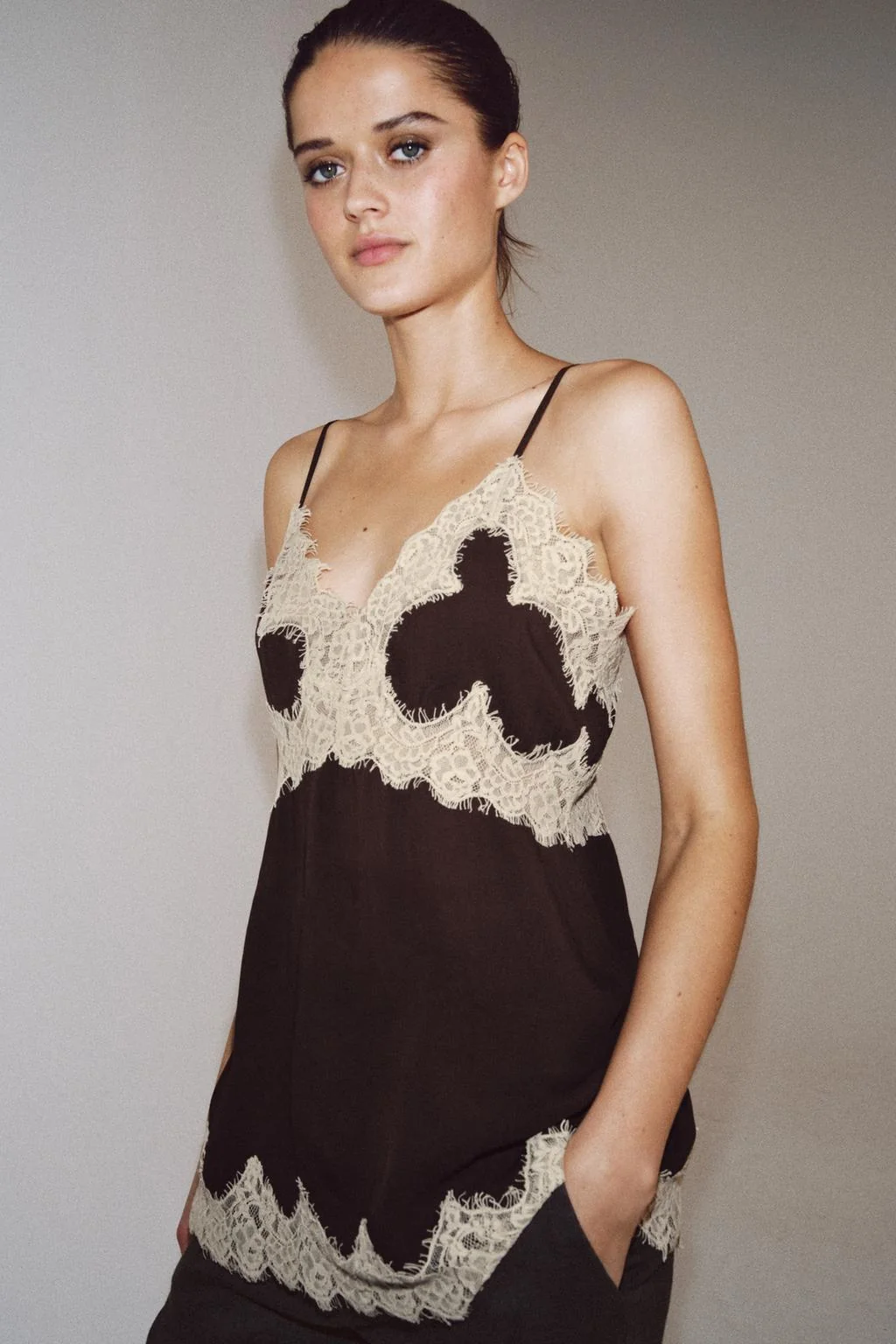 Топ с V-образным вырезом и тонкими лямками. С контрастной кружевной окантовкой и прямой юбкой.