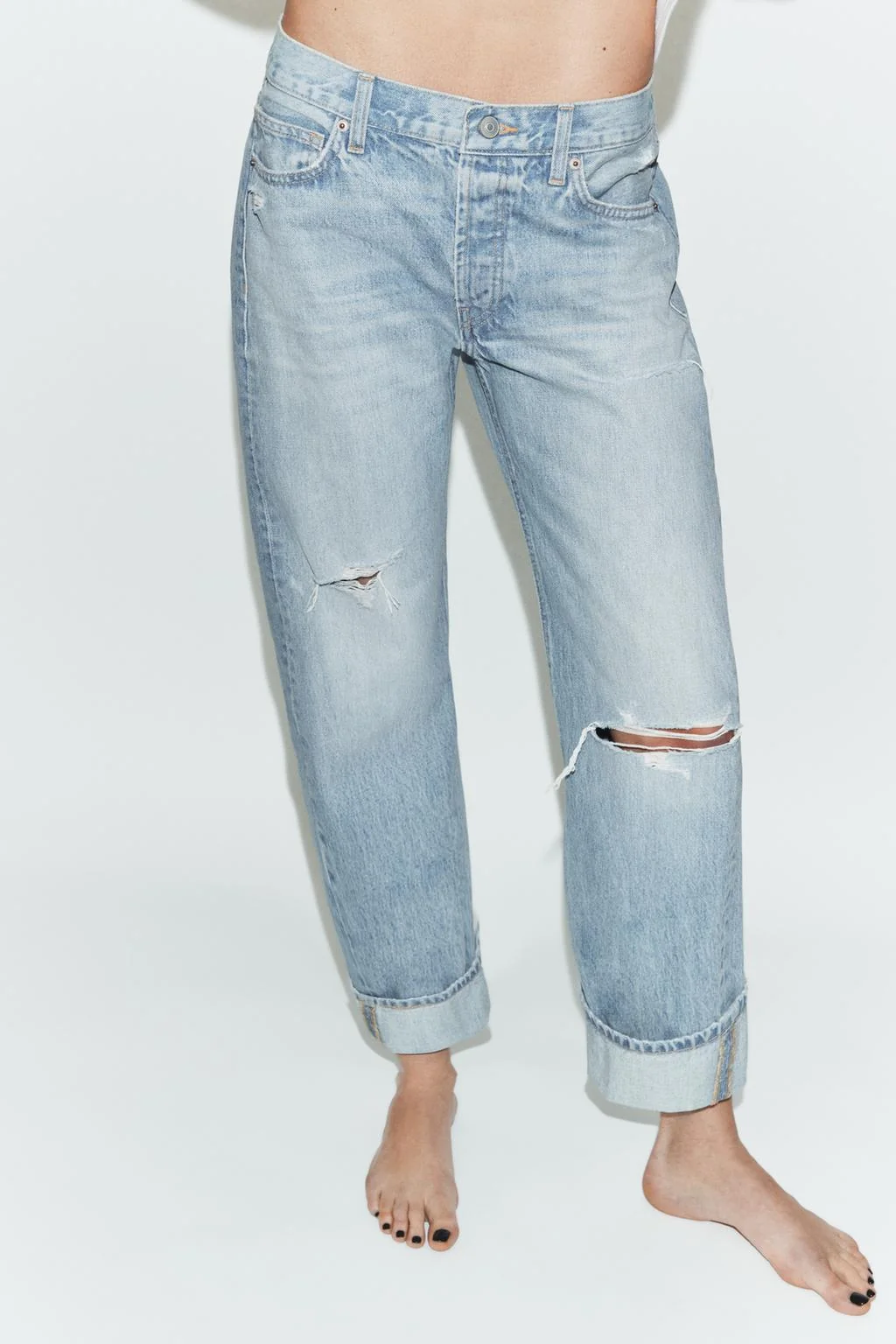 Mid-waist jeans with belt loops and five pockets. Ripped detail. Turn-up hems. Metal button fastening.