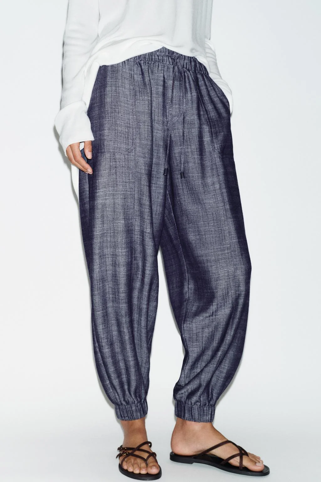 Low-rise trousers with an elasticated drawstring waistband. Featuring front pockets, mock welt pockets on the back and cuffed elastic hems.