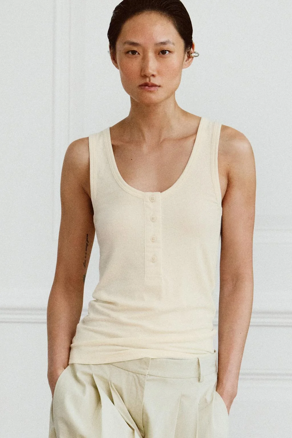 T-shirt made from linen blend yarn. Featuring a round neckline and sleeveless design. Ribbed fabric. Straight hem. Button-up front.