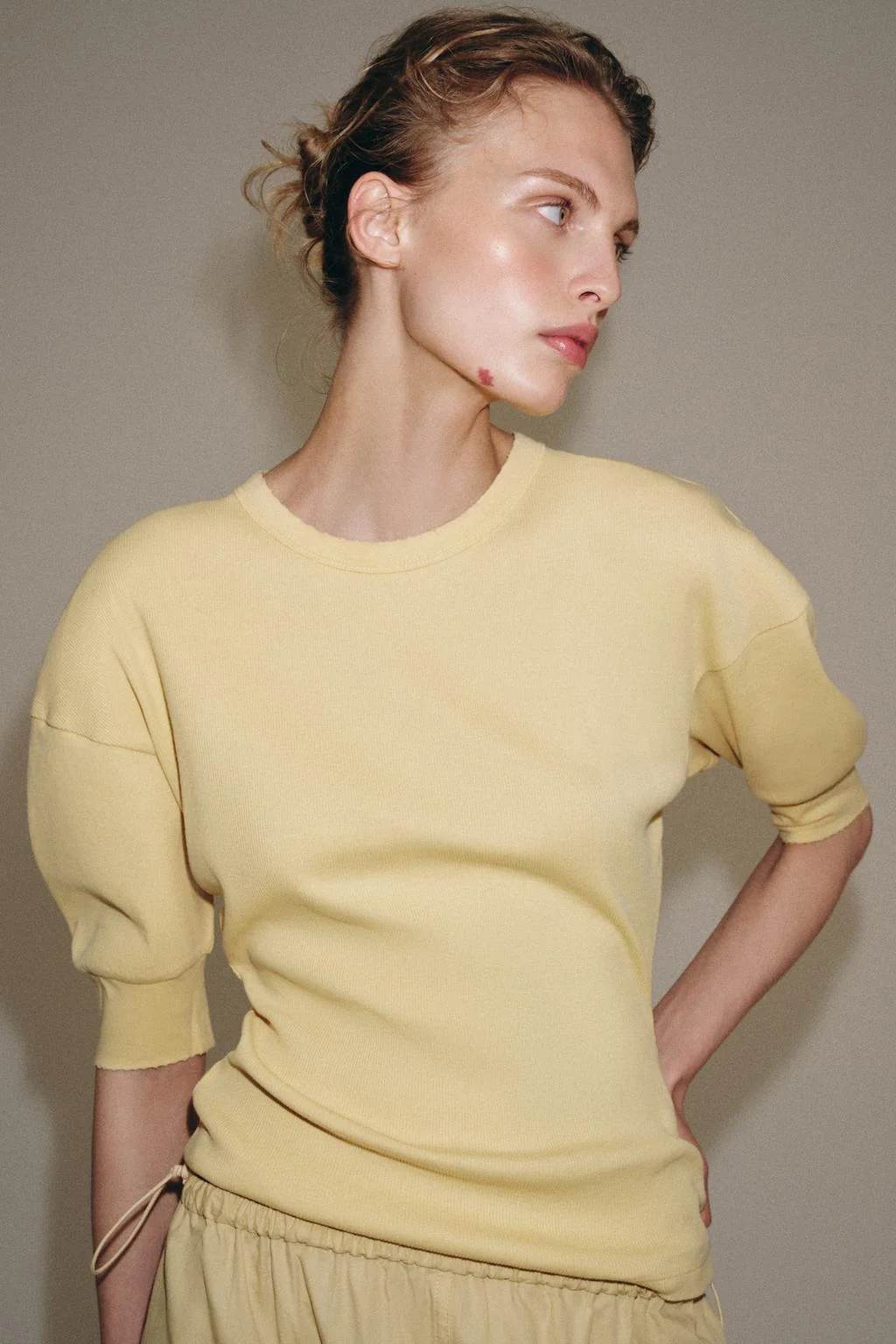 T-shirt with main fabric made from spun cotton. Features a round neck and voluminous three-quarter sleeves. Ribbed fabric. Straight hem.