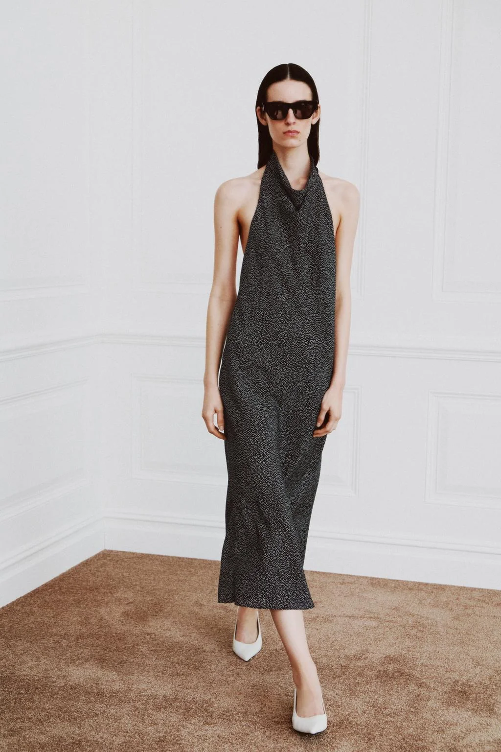 Dress made from a main fabric blend of cotton and viscose. Featuring a flowing halter neck and open shoulders. Open back. Flared hem. Button fastening at the neck.