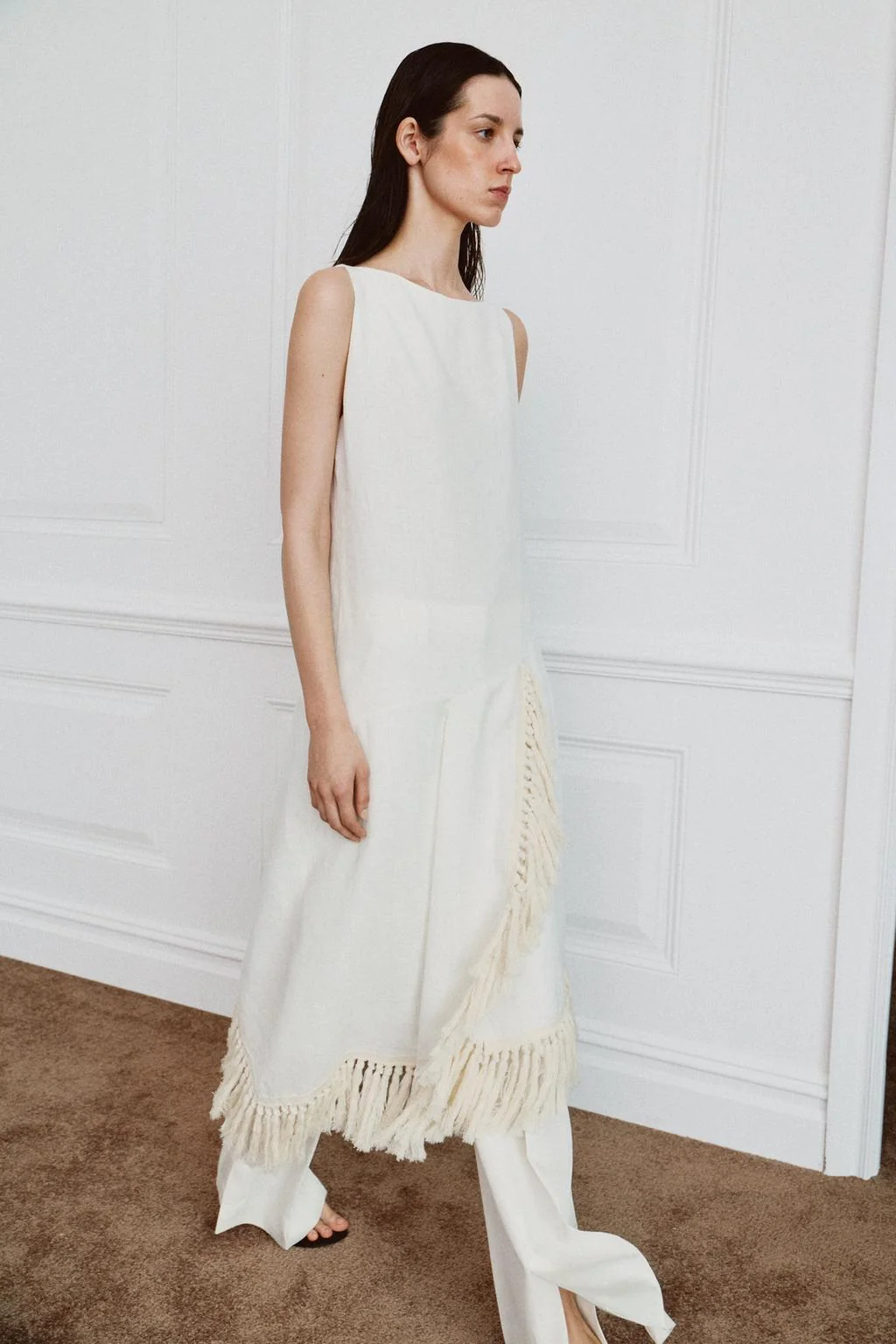 Midi dress with main fabric made from linen yarn. Boat neck and sleeveless design. Contrast fringe detail. Asymmetric hem. Concealed zip fastening in the seam.