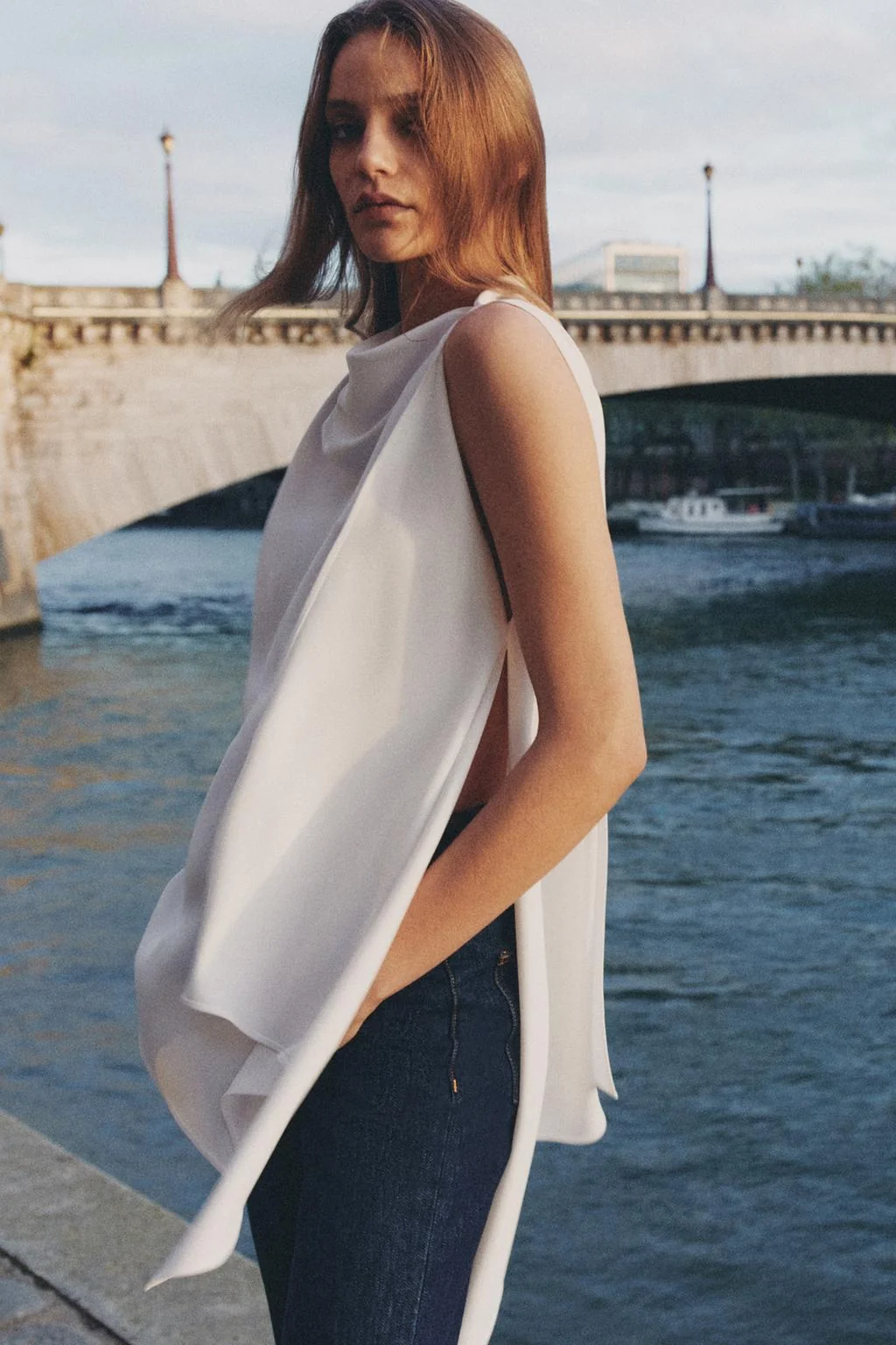 Top with a flowing neckline and cape sleeves. Asymmetric hem.