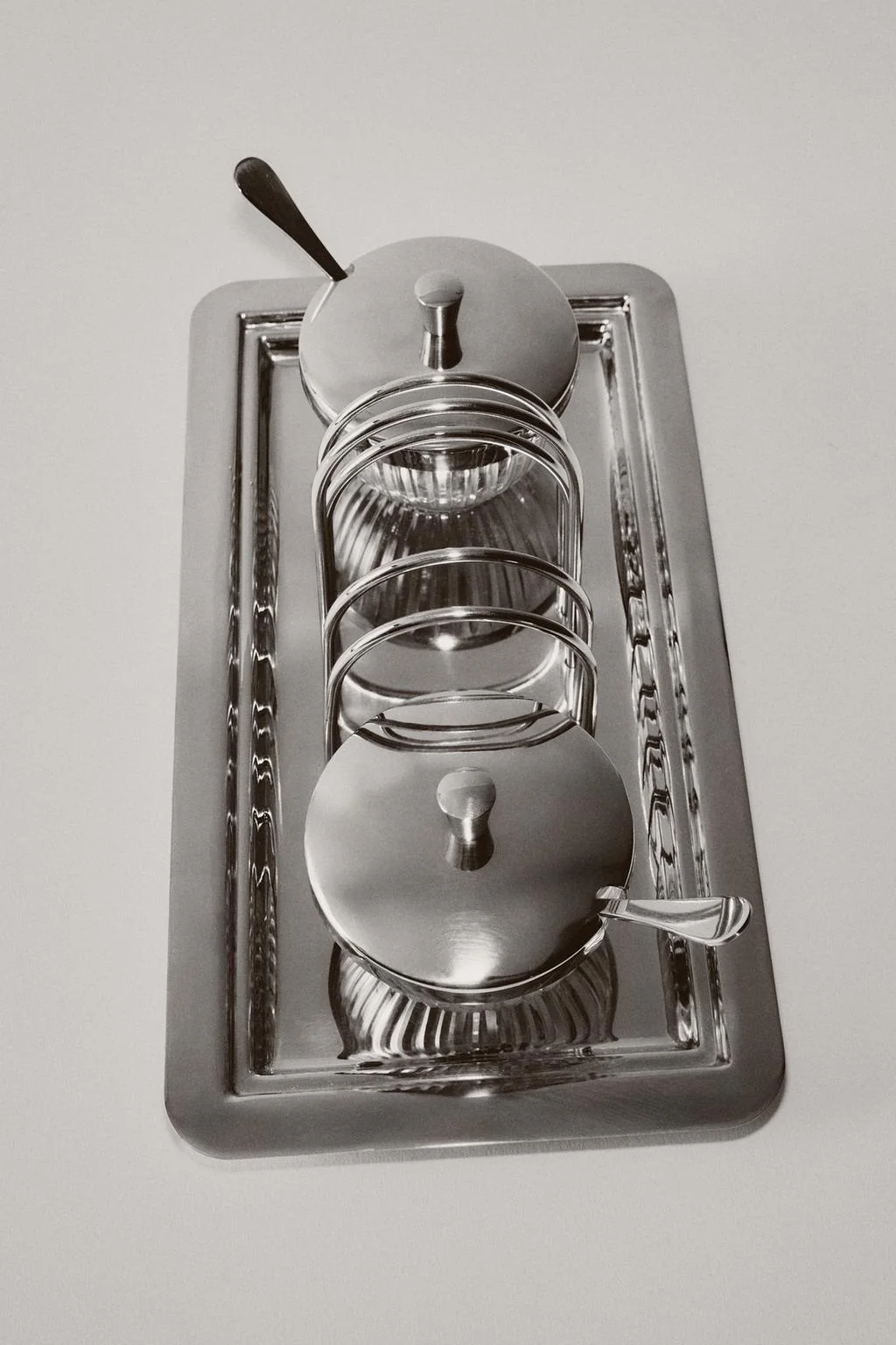 Прямоугольная стойка из нержавеющей стали с отсеками для тостов и декоративными краями. В комплект входят два стеклянных контейнера с вертикальной рифленой текстурой, металлические крышки и подходящие ложки.