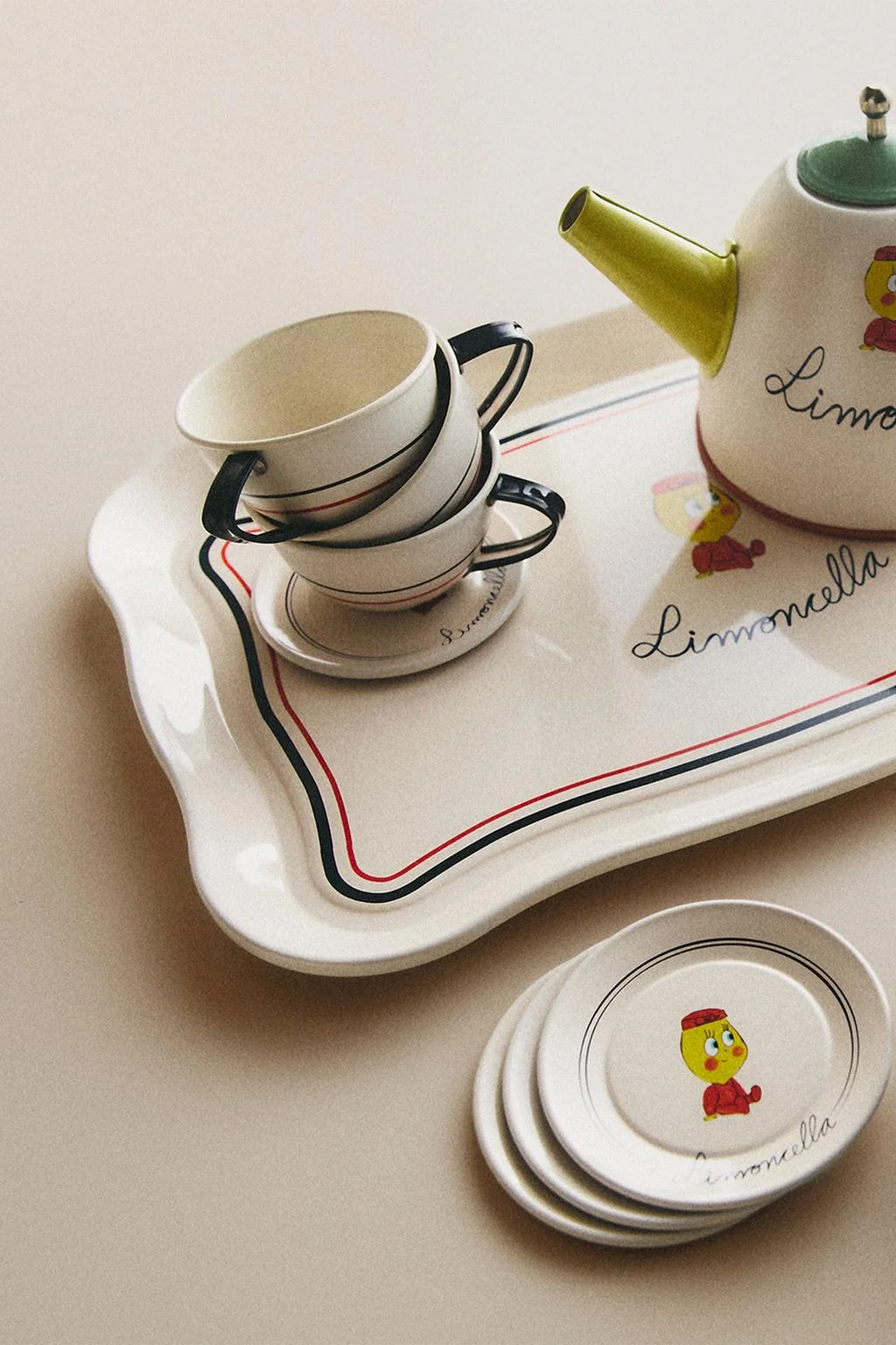 В набор входят четыре чашки, четыре маленькие тарелки, четыре большие тарелки, поднос и чайник.
