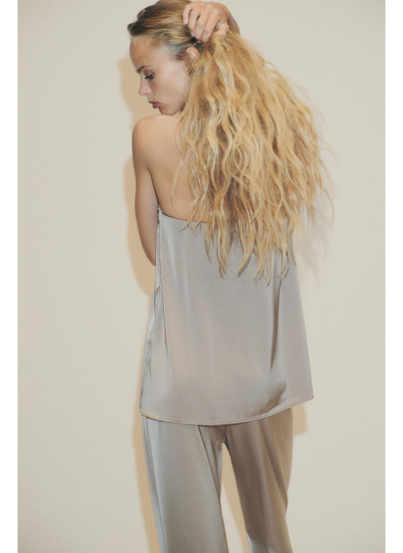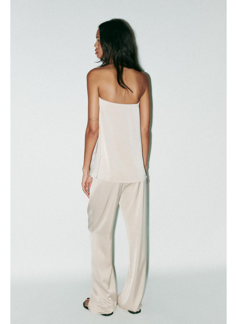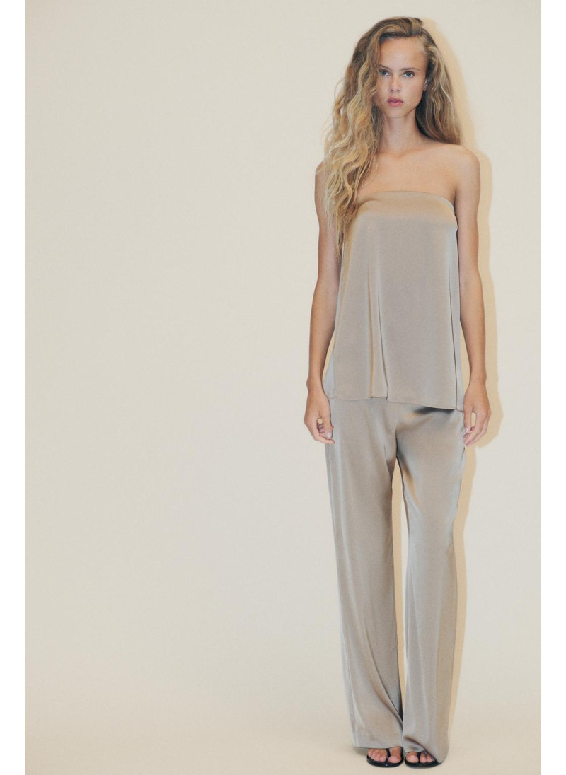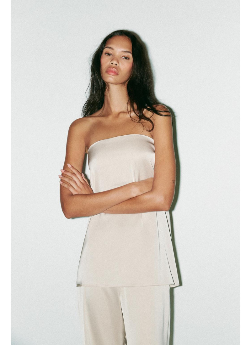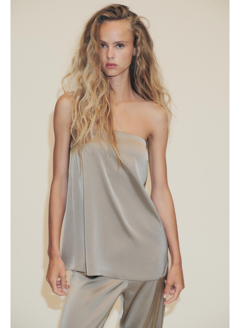 Топ изготовлен из атласной ткани. Прямой крой, открытое декольте на плечах. Внутренний бандо из той же ткани. Боковая молния, скрытая в шве.