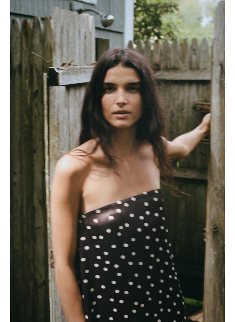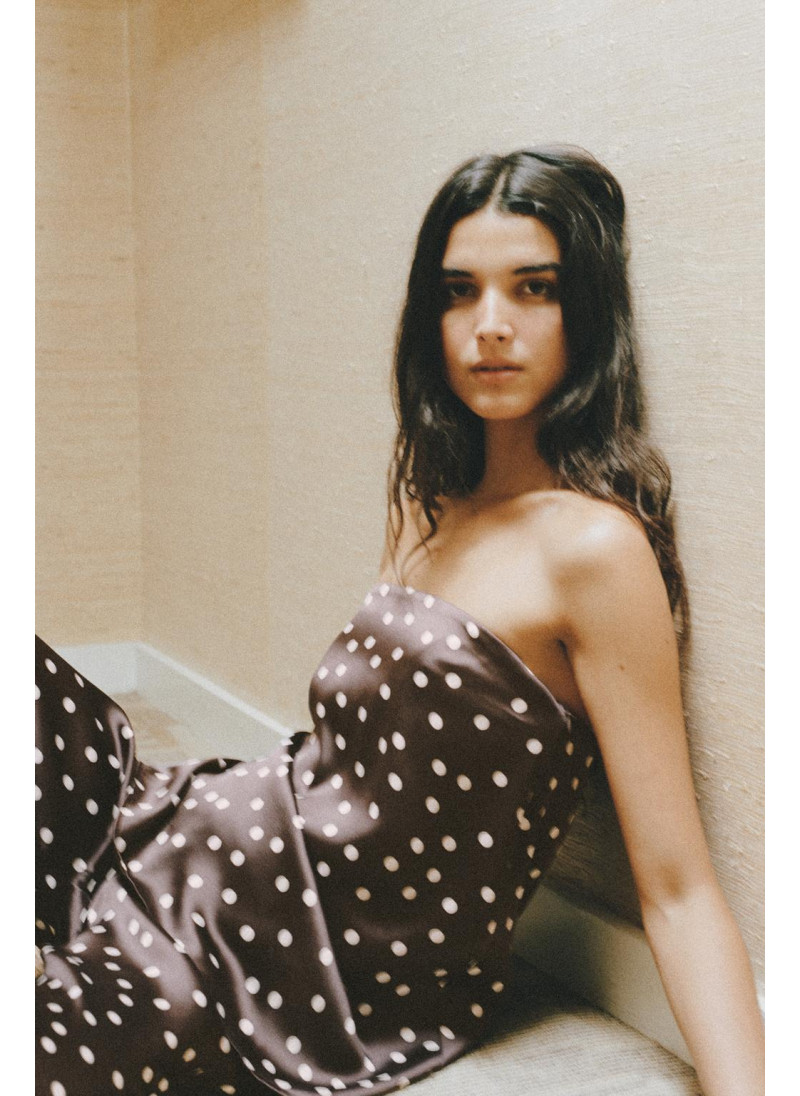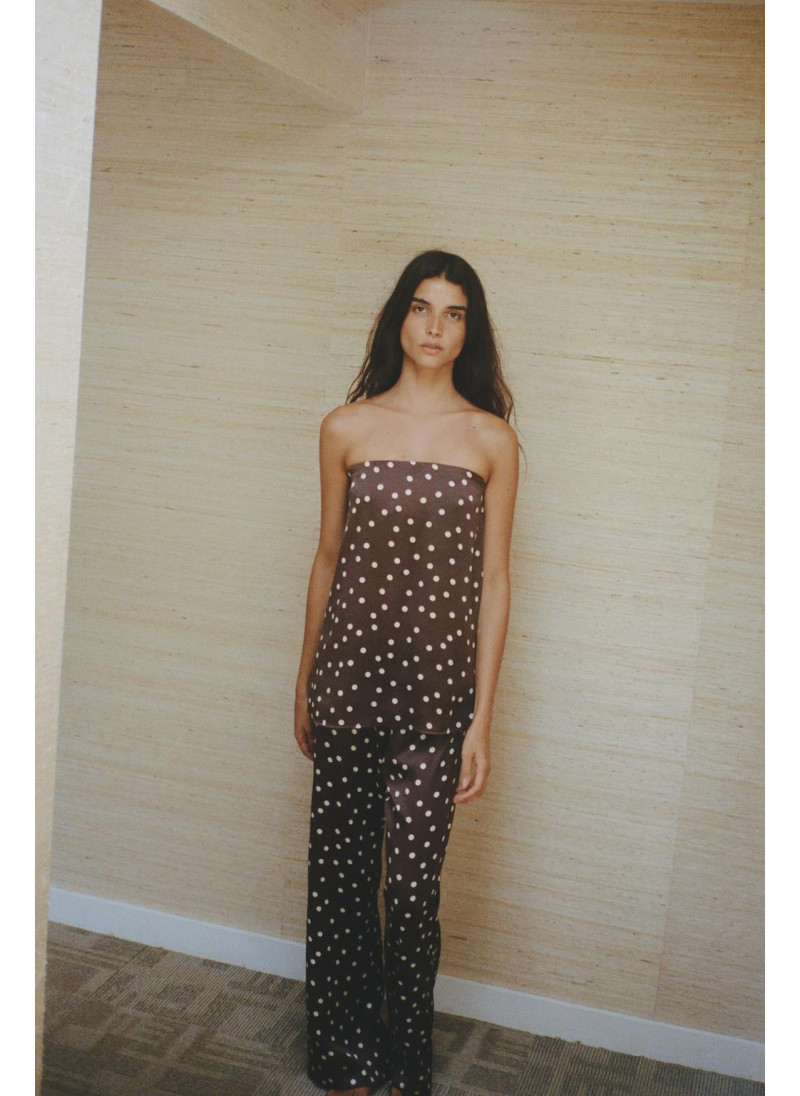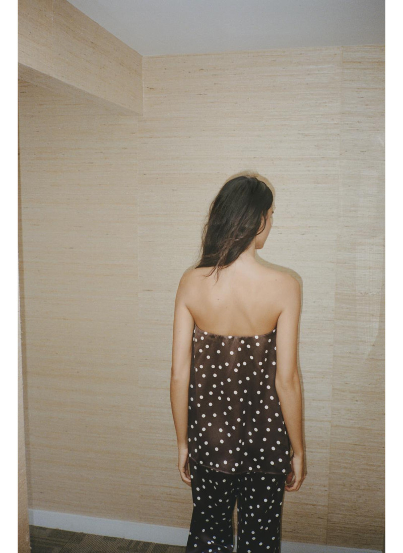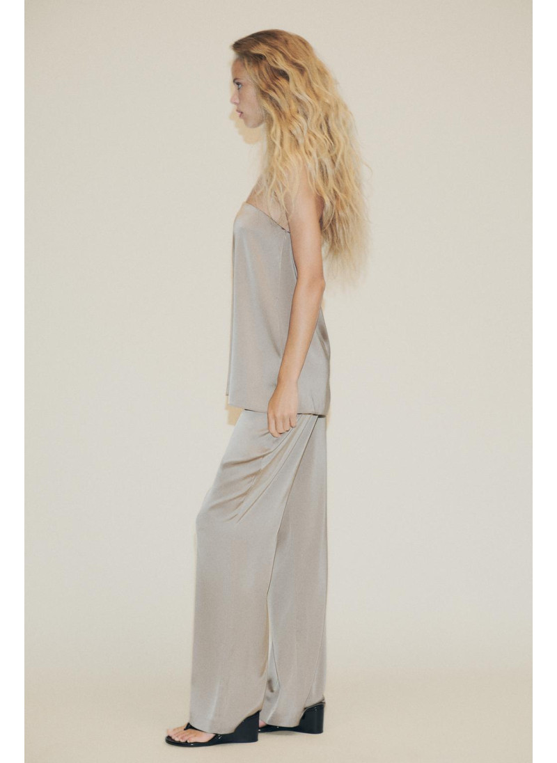 Топ изготовлен из атласной ткани. Прямой крой, открытое декольте на плечах. Внутренний бандо из той же ткани. Боковая молния, скрытая в шве.