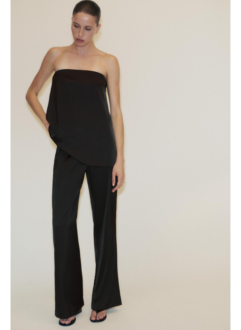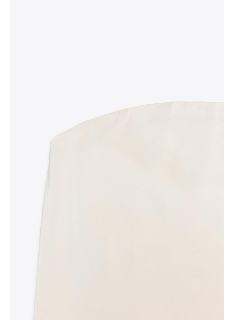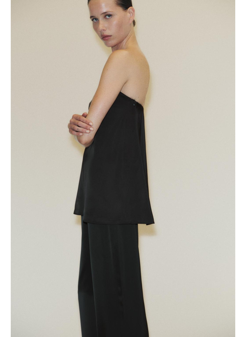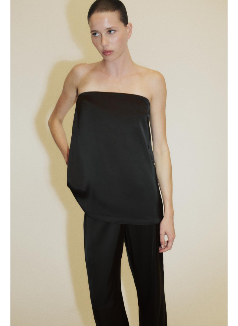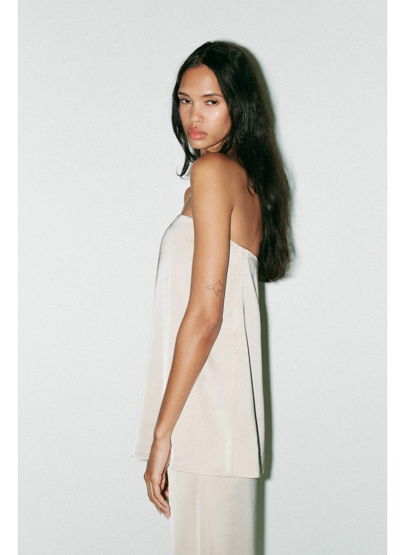 Топ изготовлен из атласной ткани. Прямой крой, открытое декольте на плечах. Внутренний бандо из той же ткани. Боковая молния, скрытая в шве...