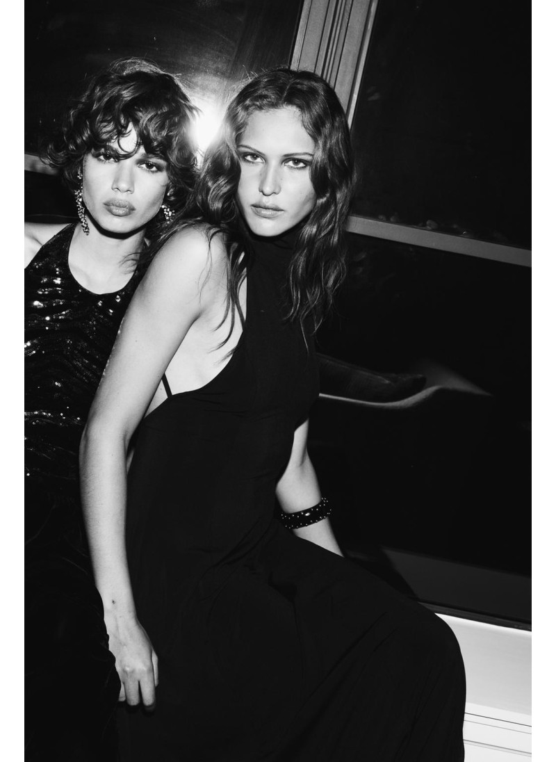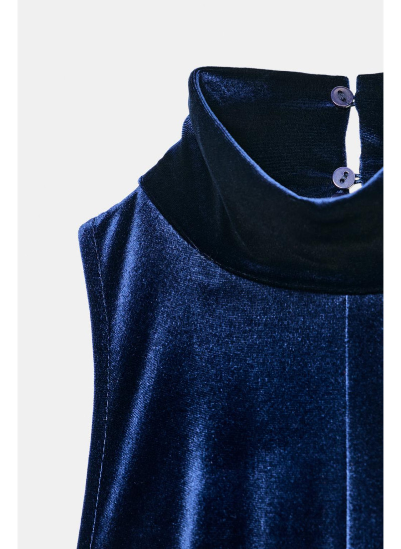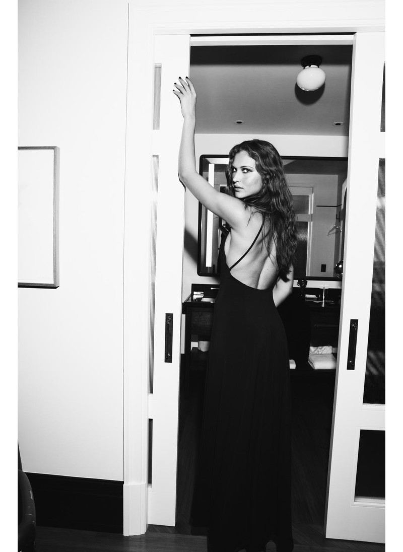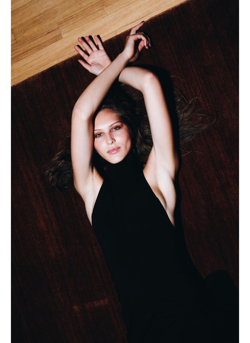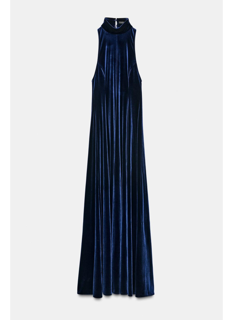 Длинное платье с вырезом галтер и открытой спиной. Имеет тонкие бретельки и скрытую застежку на пуговицы.