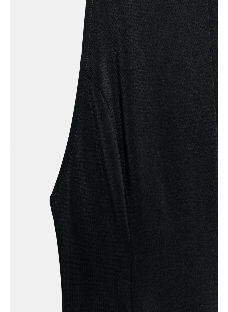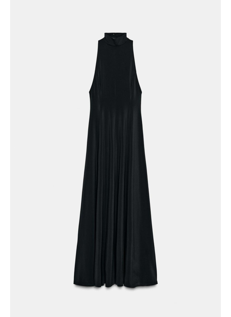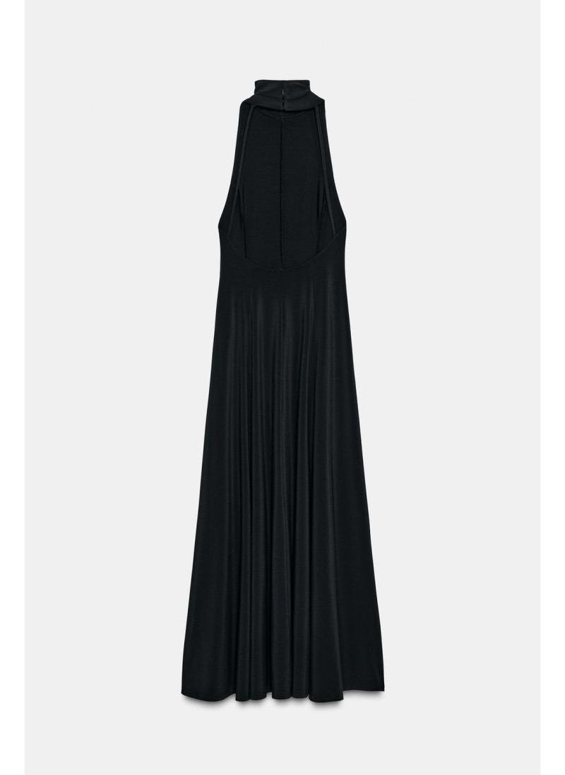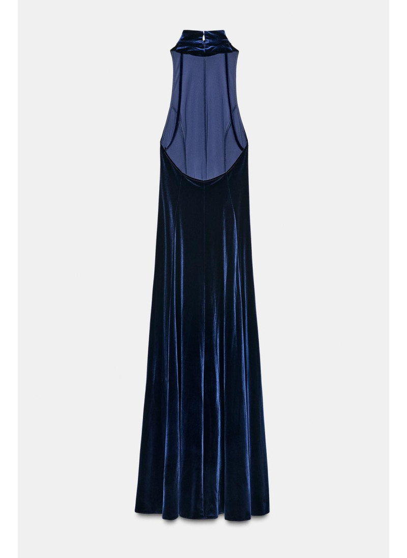 Длинное платье с вырезом галтер и открытой спиной. Имеет тонкие бретельки и скрытую застежку на пуговицы...