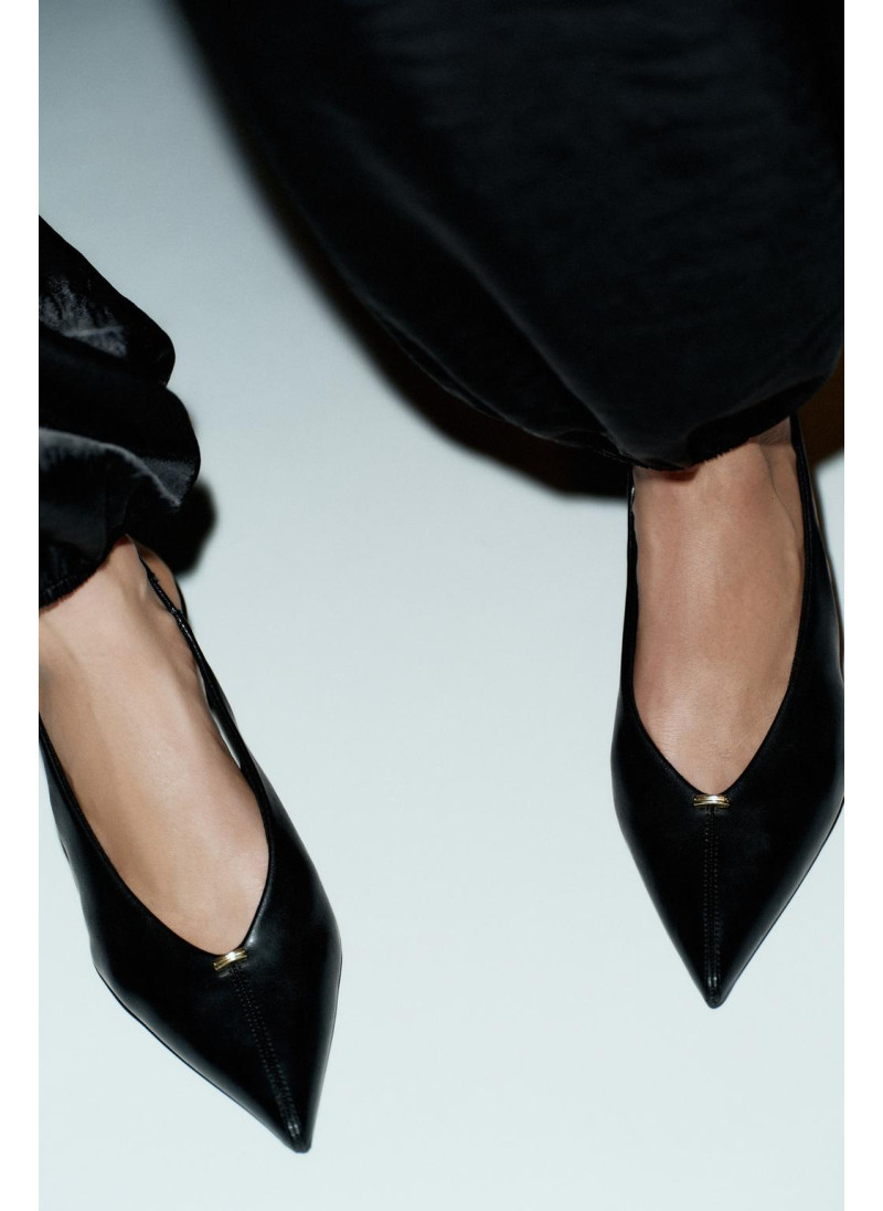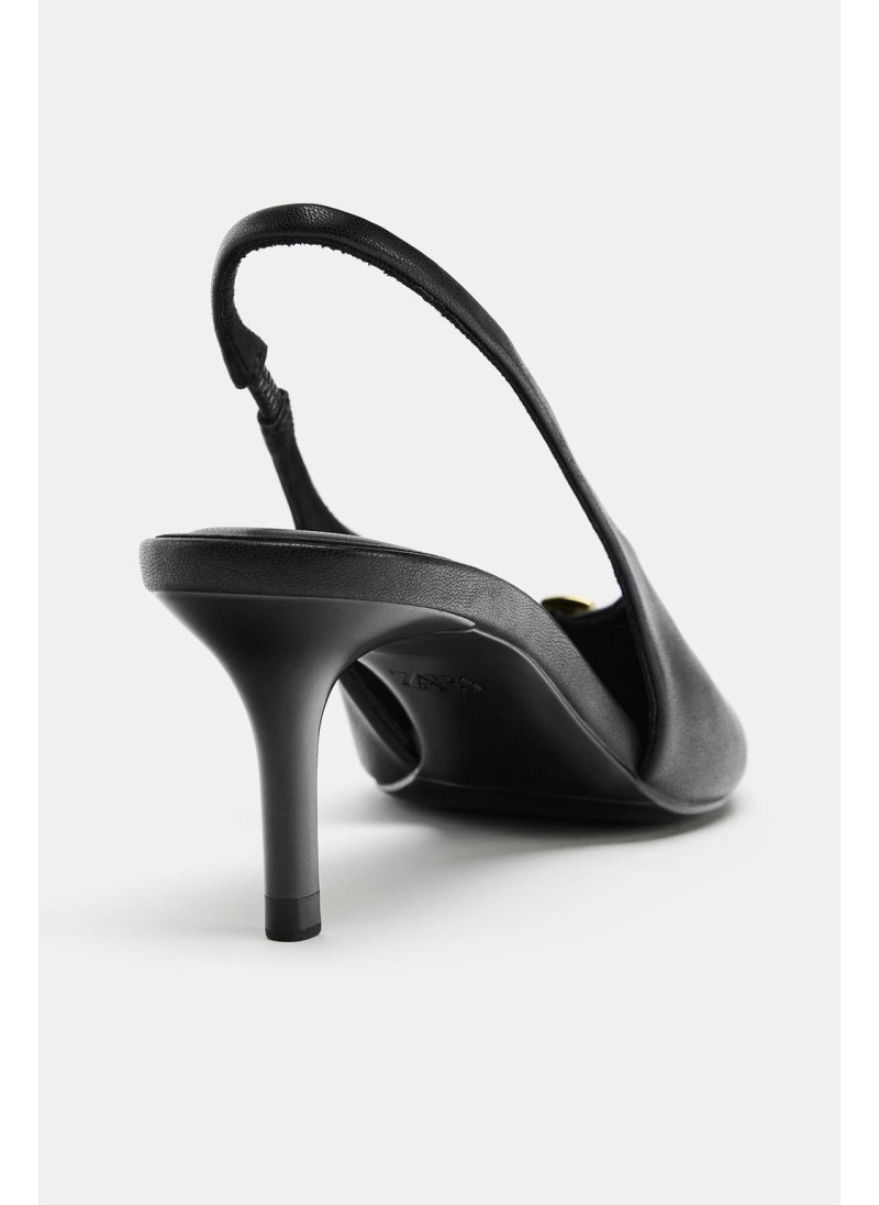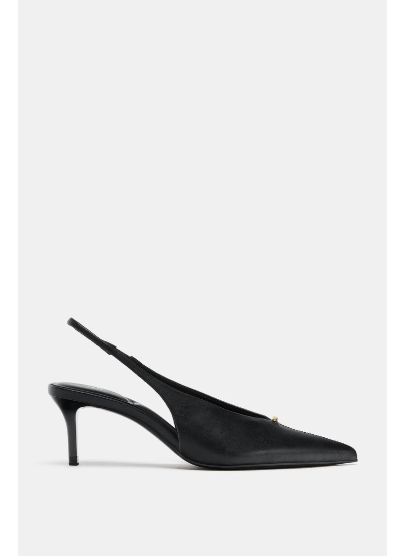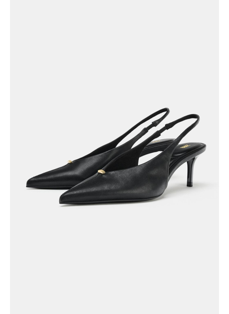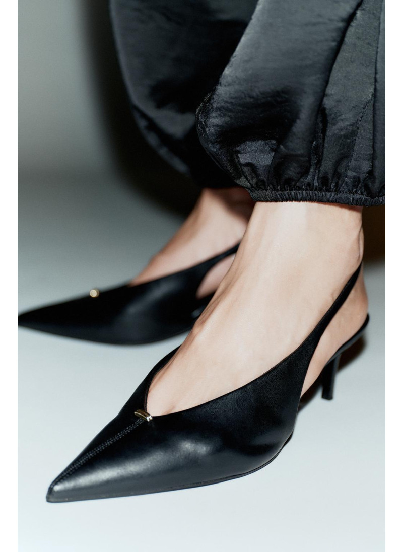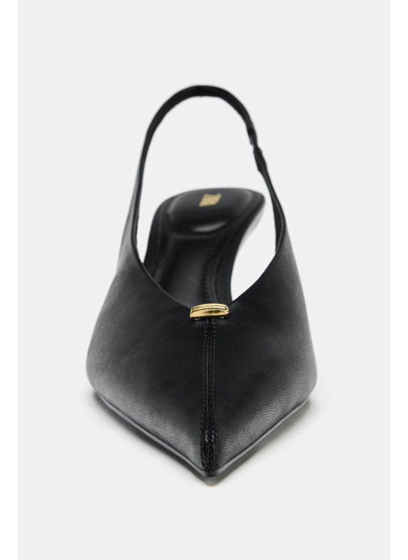 Туфли-мюли на тонком высоком каблуке. Декоративная строчка спереди. V-образный вырез с металлической деталью. Ремешок сзади с эластичной вставкой. Острый нос. Высота каблука: 7 см..