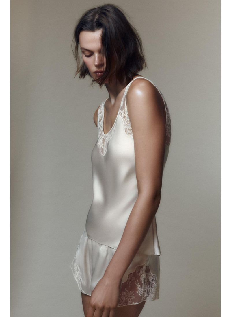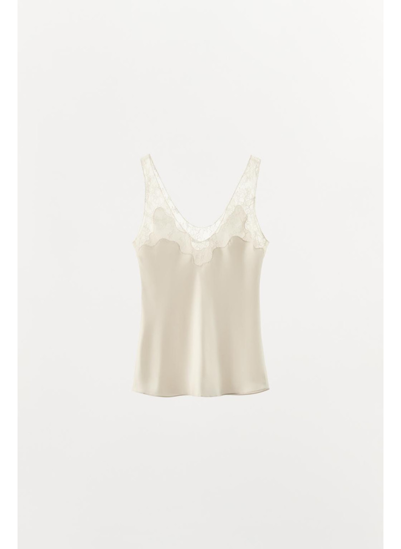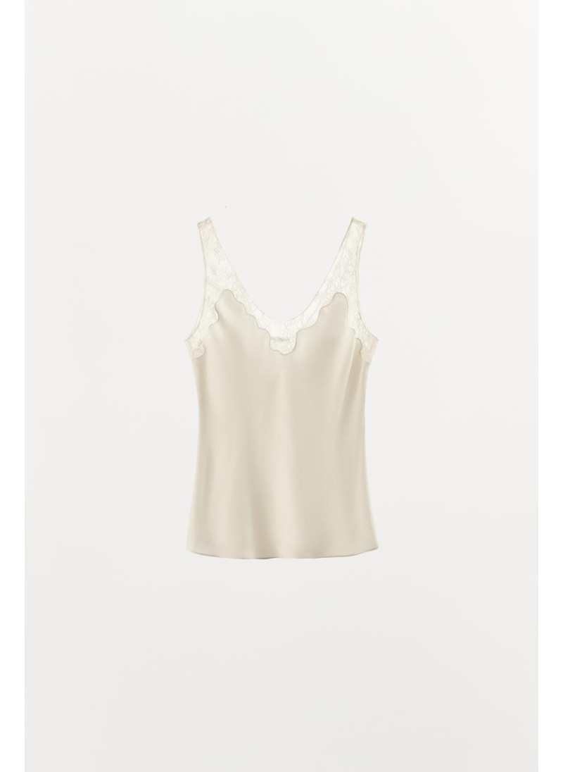 Блузка-торсидка из атласа. Круглый вырез и широкие лямки. Декорирована кружевными вставками в тон.