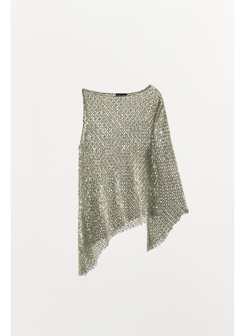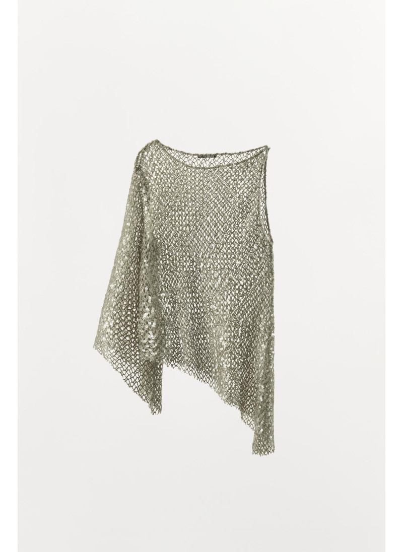 Полупрозрачный топ с лодочным вырезом, дизайном без рукавов и длинным рукавом, завершенный в форме буквы A. Украшен контрастными аппликациями из пайеток и асимметричным подолом.